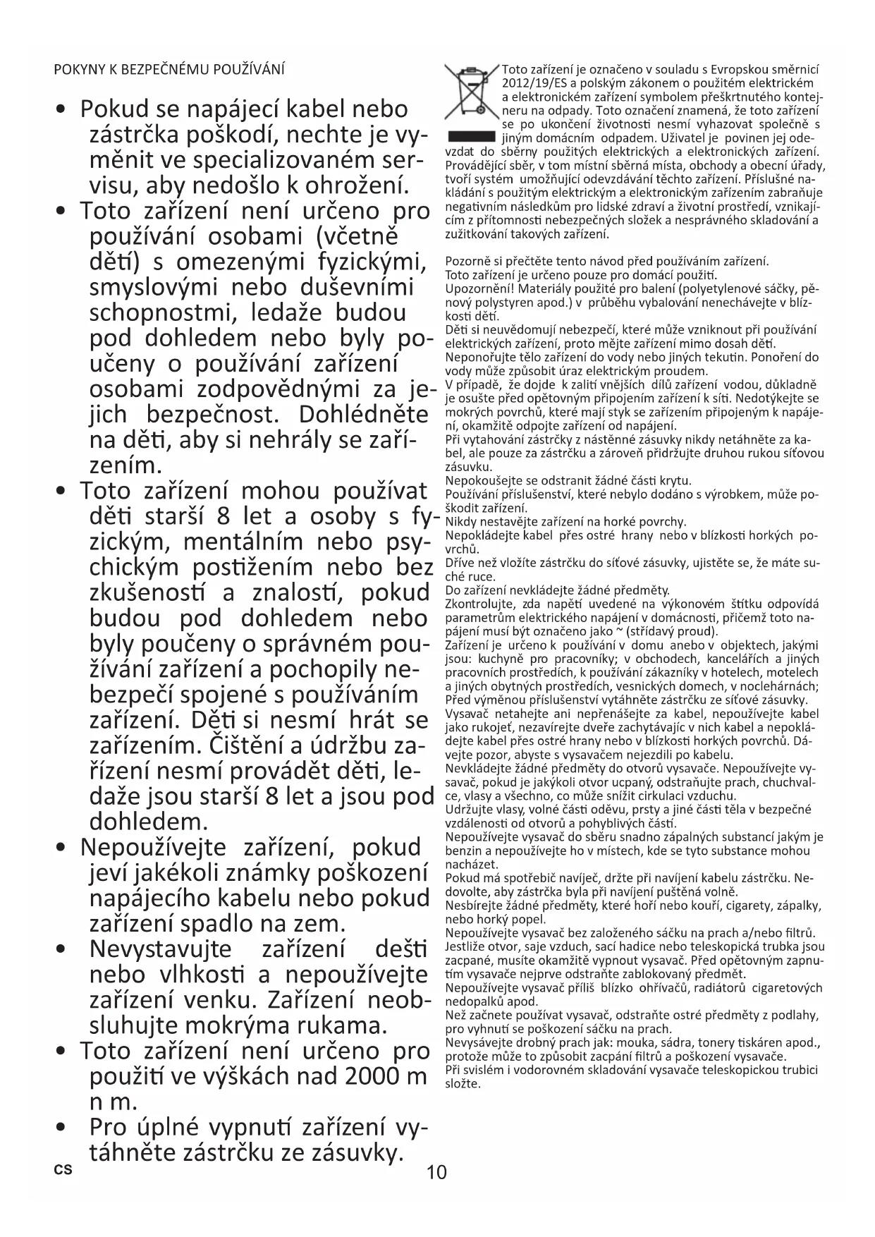 - Pro úplné vypnu zařízení vy- táhněte zástrčku ze zásuvky. Toto zařízení je označeno v souladu s Evropskou směrnicí 2012/19/ES a polským zákonem o použitém elektrickém a elektronickém zařízení symbolem přeškrtnutého kontej- neru na odpady. Toto označení znamená, že toto zařízení se po ukončení životnos nesmí vyhazovat společně s jiným domácním odpadem. Uživatel je povinen jej ode- vzdat do sběrny použitých elektrických a elektronických zařízení. Provádějící sběr, v tom místní sběrná místa, obchody a obecní úřady, tvoří systém umožňující odevzdávání těchto zařízení. Příslušné na- kládání s použitým elektrickým a elektronickým zařízením zabraňuje negavním následkům pro lidské zdraví a životní prostředí, vznikají- cím z přítomnos nebezpečných složek a nesprávného skladování a zužitkování takových zařízení. Pozorně si přečtěte tento návod před používáním zařízení. Toto zařízení je určeno pouze pro domácí použi. Upozornění! Materiály použité pro balení (polyetylenové sáčky, pě- nový polystyren apod.) v průběhu vybalování nenechávejte v blíz- kos dě. Dě si neuvědomují nebezpečí, které může vzniknout při používání elektrických zařízení, proto mějte zařízení mimo dosah dě. Neponořujte tělo zařízení do vody nebo jiných tekun. Ponoření do vody může způsobit úraz elektrickým proudem. V případě, že dojde k zali vnějších dílů zařízení vodou, důkladně je osušte před opětovným připojením zařízení k sí. Nedotýkejte se mokrých povrchů, které mají styk se zařízením připojeným k napáje- ní, okamžitě odpojte zařízení od napájení. Při vytahování zástrčky z nástěnné zásuvky nikdy netáhněte za ka- bel, ale pouze za zástrčku a zároveň přidržujte druhou rukou síťovou zásuvku. Nepokoušejte se odstranit žádné čás krytu. Používání příslušenství, které nebylo dodáno s výrobkem, může po- škodit zařízení. Nikdy nestavějte zařízení na horké povrchy. Nepokládejte kabel přes ostré hrany nebo v blízkos horkých po- vrchů. Dříve než vložíte zástrčku do síťové zásuvky, ujistěte se, že máte su- ché ruce. Do zařízení nevkládejte žádné předměty. Zkontrolujte, zda napě uvedené na výkonovém štku odpovídá parametrům elektrického napájení v domácnos, přičemž toto na- pájení musí být označeno jako ~ (střídavý proud). Zařízení je určeno k používání v domu anebo v objektech, jakými jsou: kuchyně pro pracovníky; v obchodech, kancelářích a jiných pracovních prostředích, k používání zákazníky v hotelech, motelech a jiných obytných prostředích, vesnických domech, v noclehárnách; Před výměnou příslušenství vytáhněte zástrčku ze síťové zásuvky. Vysavač netahejte ani nepřenášejte za kabel, nepoužívejte kabel jako rukojeť, nezavírejte dveře zachytávajíc v nich kabel a nepoklá- dejte kabel přes ostré hrany nebo v blízkos horkých povrchů. Dá- vejte pozor, abyste s vysavačem nejezdili po kabelu. Nevkládejte žádné předměty do otvorů vysavače. Nepoužívejte vy- savač, pokud je jakýkoli otvor ucpaný, odstraňujte prach, chuchval- ce, vlasy a všechno, co může snížit cirkulaci vzduchu. Udržujte vlasy, volné čás oděvu, prsty a jiné čás těla v bezpečné vzdálenos od otvorů a pohyblivých čás. Nepoužívejte vysavač do sběru snadno zápalných substancí jakým je benzin a nepoužívejte ho v místech, kde se tyto substance mohou nacházet. Pokud má spotřebič navíječ, držte při navíjení kabelu zástrčku. Ne- dovolte, aby zástrčka byla při navíjení puštěná volně. Nesbírejte žádné předměty, které hoří nebo kouří, cigarety, zápalky, nebo horký popel. Nepoužívejte vysavač bez založeného sáčku na prach a/nebo ltrů. Jestliže otvor, saje vzduch, sací hadice nebo teleskopická trubka jsou zacpané, musíte okamžitě vypnout vysavač. Před opětovným zapnu- m vysavače nejprve odstraňte zablokovaný předmět. Nepoužívejte vysavač příliš blízko ohřívačů, radiátorů cigaretových nedopalků apod. Než začnete používat vysavač, odstraňte ostré předměty z podlahy, pro vyhnu se poškození sáčku na prach. Nevysávejte drobný prach jak: mouka, sádra, tonery skáren apod., protože může to způsobit zacpání ltrů a poškození vysavače. Při svislém i vodorovném skladování vysavače teleskopickou trubici složte.11