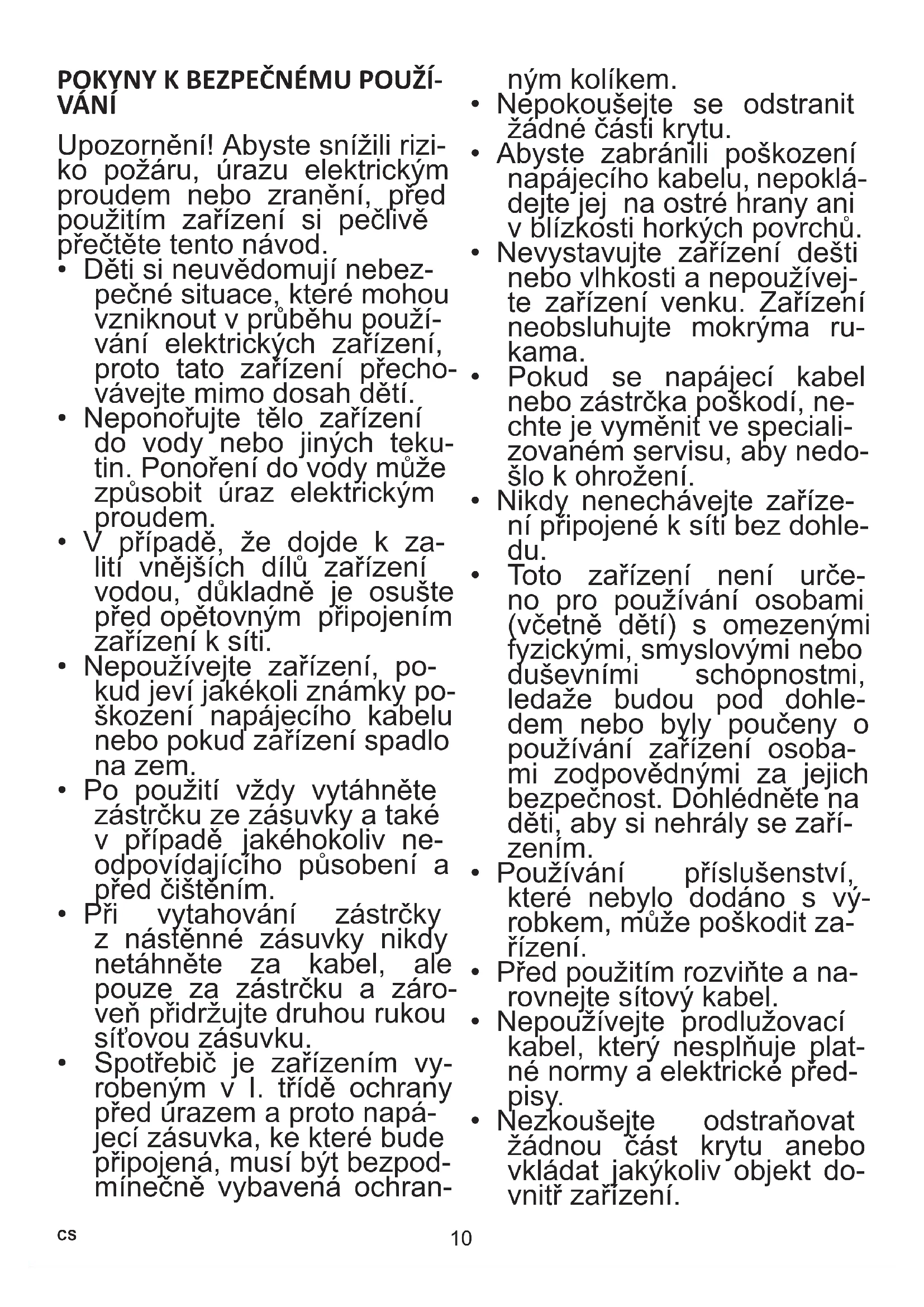 - Spotřebič je zařízením vy- robeným v I. třídě ochrany před úrazem a proto napá- jecí zásuvka, ke které bude připojená, musí být bezpod- mínečně vybavená ochran- ným kolíkem.