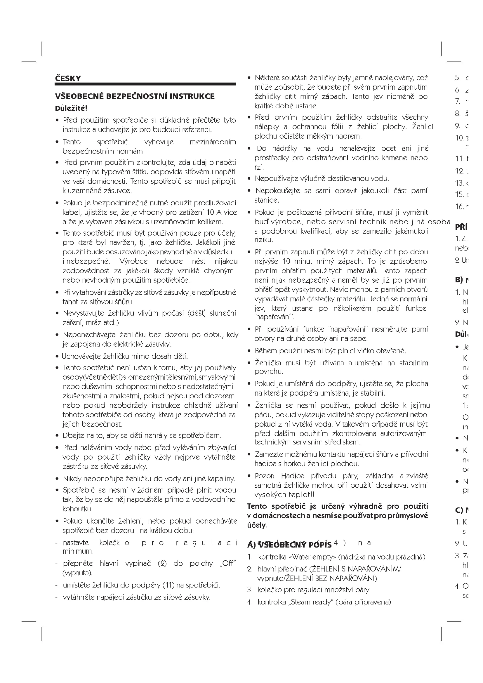 - Tento spotřebič musí být používán pouze pro účely, pro které byl navržen, tj. jako žehlička. Jakékoli jiné použití bude posuzováno jako nevhodné a v důsledku i nebezpečné. Výrobce nebude nést nijakou zodpovědnost za jakékoli škody vzniklé chybným nebo nevhodným použitím spotřebiče.