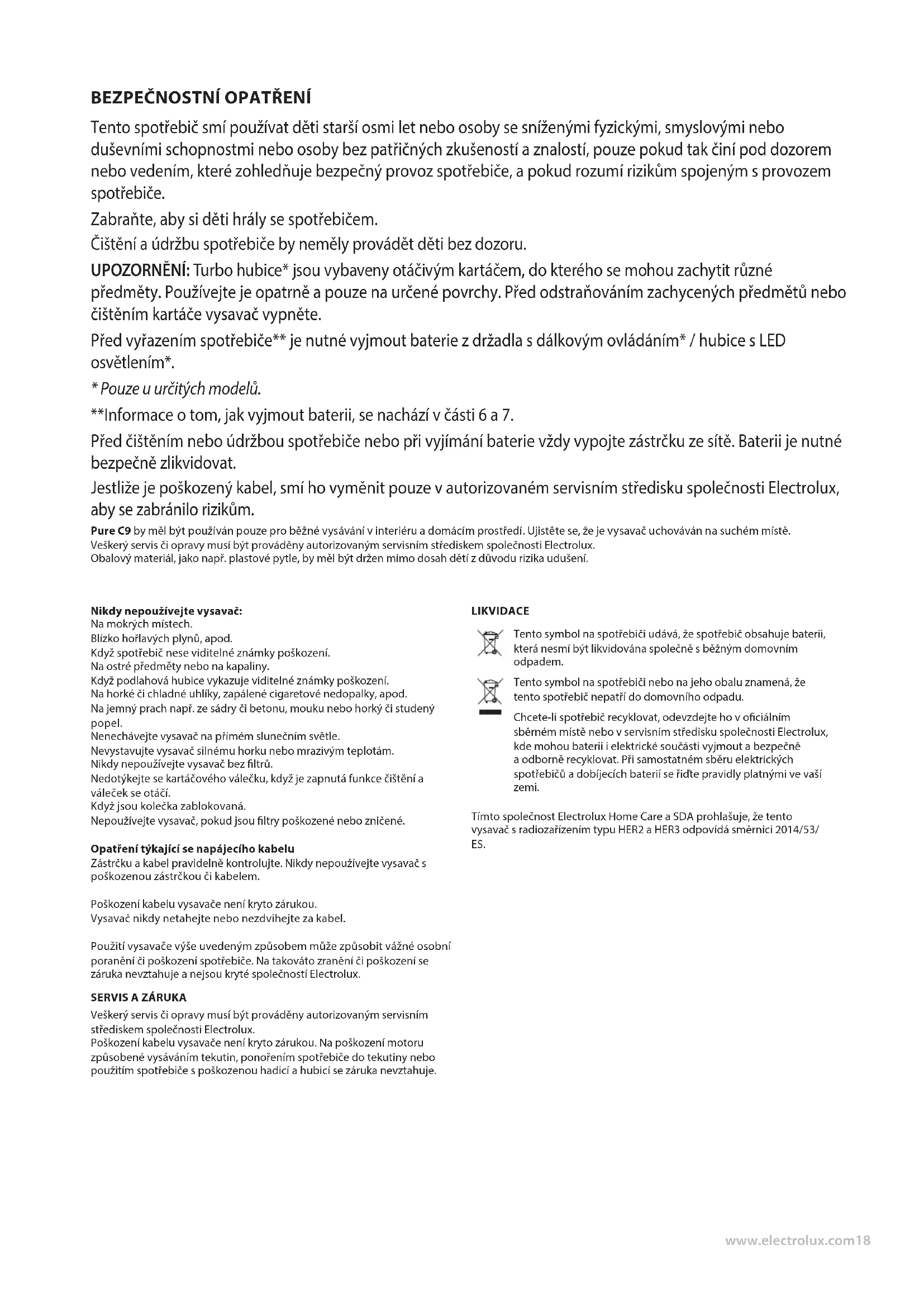 Veškerý servis či opravy musí být prováděny autorizovaným servisním střediskem společnosti Electrolux. Poškození kabelu vysavače není kryto zárukou. Na poškození motoru způsobené vysáváním tekutin, ponořením spotřebiče do tekutiny nebo použitím spotřebiče s poškozenou hadicí a hubicí se záruka nevztahuje. LIKVIDACE Tento symbol na spotřebiči udává, že spotřebič obsahuje baterii, která nesmí být likvidována společně s běžným domovním odpadem. Tento symbol na spotřebiči nebo na jeho obalu znamená, že tento spotřebič nepatří do domovního odpadu. Chcete-li spotřebič recyklovat, odevzdejte ho v ociálním sběrném místě nebo v servisním středisku společnosti Electrolux, kde mohou baterii i elektrické součásti vyjmout a bezpečně a odborně recyklovat. Při samostatném sběru elektrických spotřebičů a dobíjecích baterií se řiďte pravidly platnými ve vaší zemi. Tímto společnost Electrolux Home Care a SDA prohlašuje, že tento vysavač s radiozařízením typu HER2 a HER3 odpovídá směrnici 2014/53/ ES.19www.electrolux.com ČEŠTINA Děkujeme, že jste si zvolili vysavač Electrolux Pure C9. Vždy používejte originální příslušenství a náhradní díly k získání nejlepších výsledků. Tento spotřebič je navržen s ohledem na životní prostředí. Všechny plastové součásti jsou označeny pro účely recyklace.