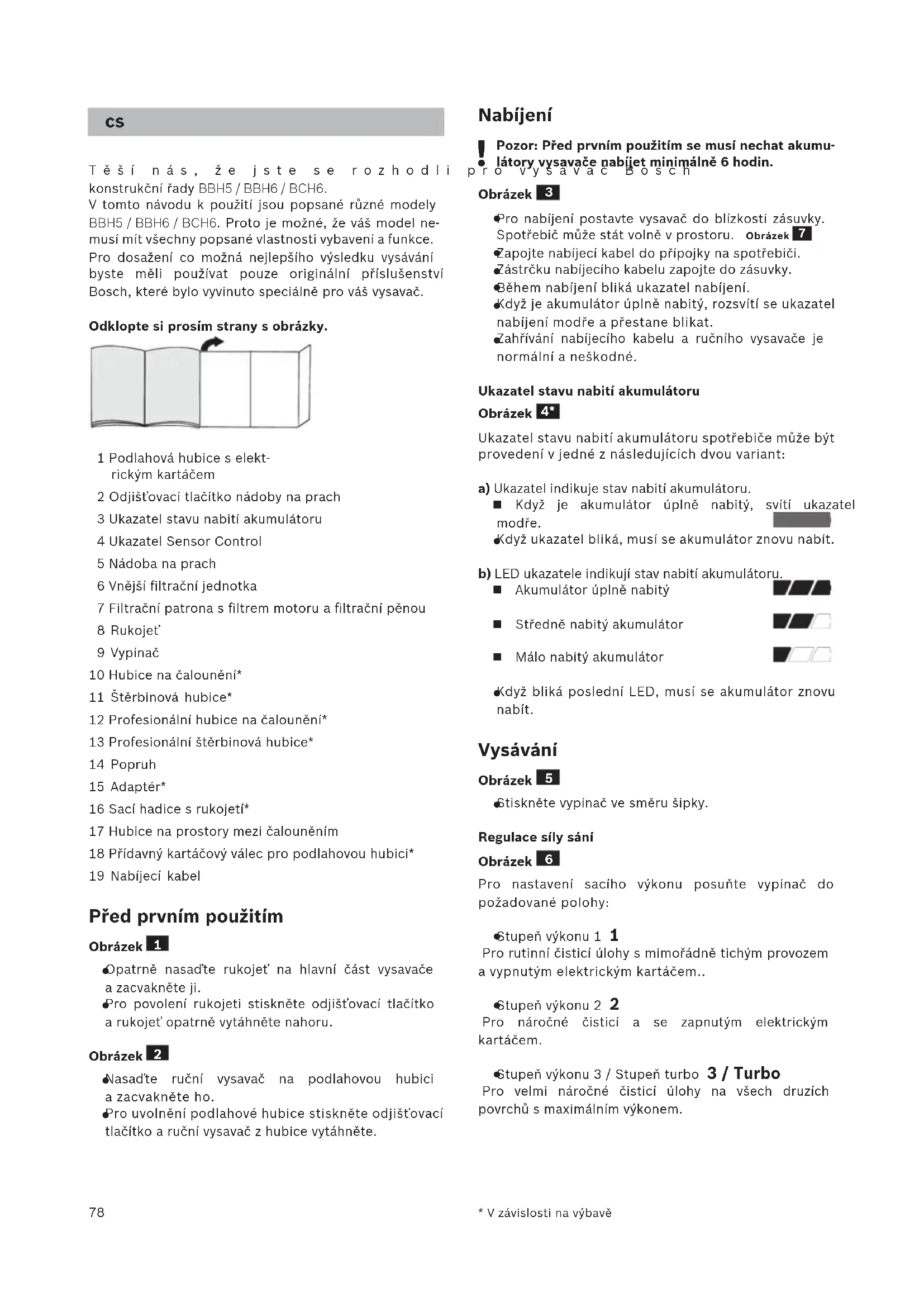 - V závislosti na výbavě Těší nás, že jste se rozhodli pro vysavač Bosch konstrukční řady BBH5 / BBH6 / BCH6. V tomto návodu k použití jsou popsané různé modely BBH5 / BBH6 / BCH6. Proto je možné, že váš model ne- musí mít všechny popsané vlastnosti vybavení a funkce. Pro dosažení co možná nejlepšího výsledku vysávání byste měli používat pouze originální příslušenství Bosch, které bylo vyvinuto speciálně pro váš vysavač. Odklopte si prosím strany s obrázky. 1 Podlahová hubice s elekt- rickým kartáčem 2 Odjišťovací tlačítko nádoby na prach 3 Ukazatel stavu nabití akumulátoru 4 Ukazatel Sensor Control 5 Nádoba na prach 6 Vnější filtrační jednotka 7 Filtrační patrona s filtrem motoru a filtrační pěnou 8 Rukojeť 9 Vypínač 10 Hubice na čalounění* 11 Štěrbinová hubice* 12 Profesionální hubice na čalounění* 13 Profesionální štěrbinová hubice* 14 Popruh 15 Adaptér* 16 Sací hadice s rukojetí* 17 Hubice na prostory mezi čalouněním 18 Přídavný kartáčový válec pro podlahovou hubici* 19 Nabíjecí kabel Před prvním použitím Obrázek