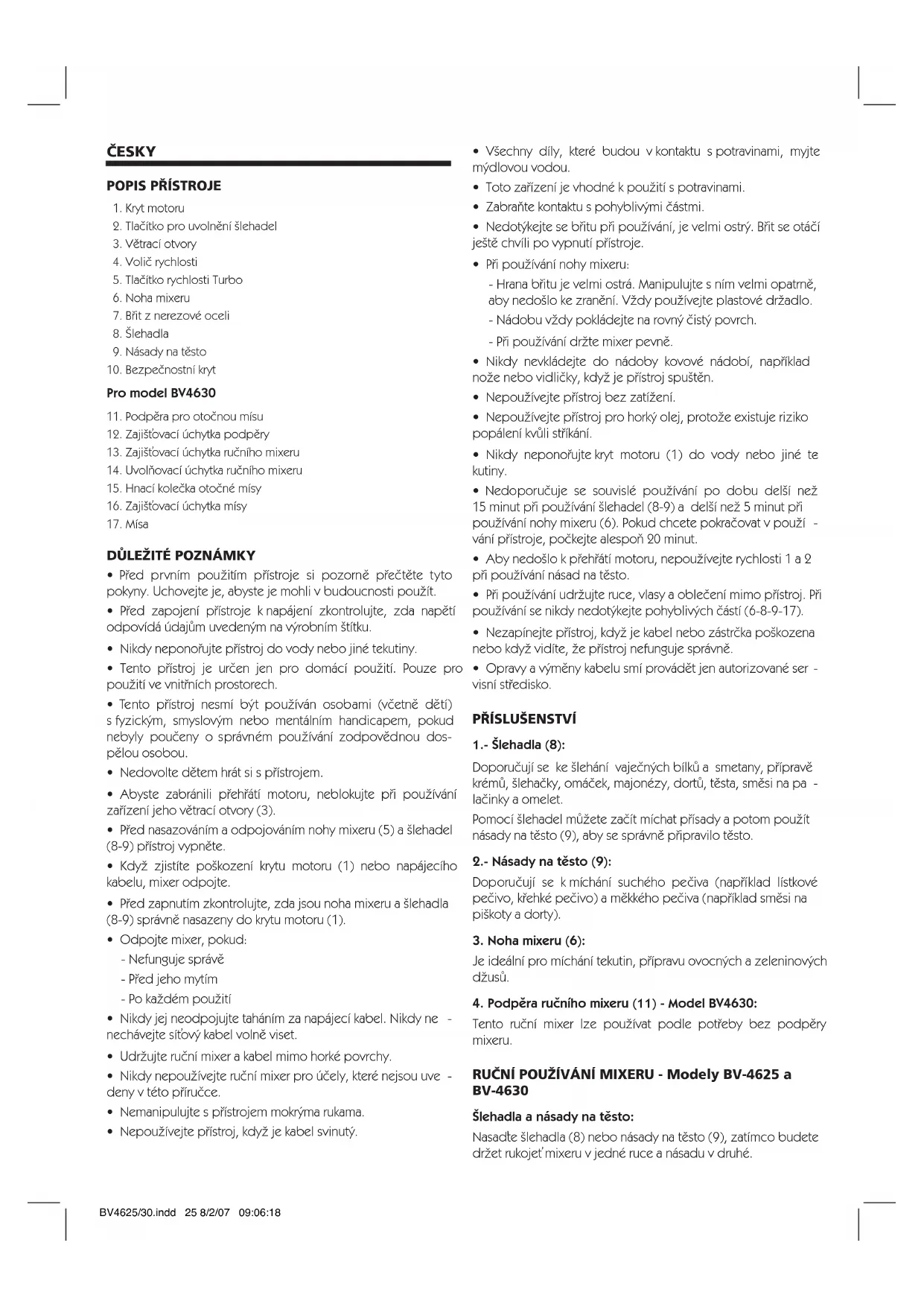 Tento ruãní mixer lze pouÏívat podle potfieby bez podpûry mixeru. RUâNÍ POUÎÍVÁNÍ MIXERU - Modely BV-4625 a BV-4630