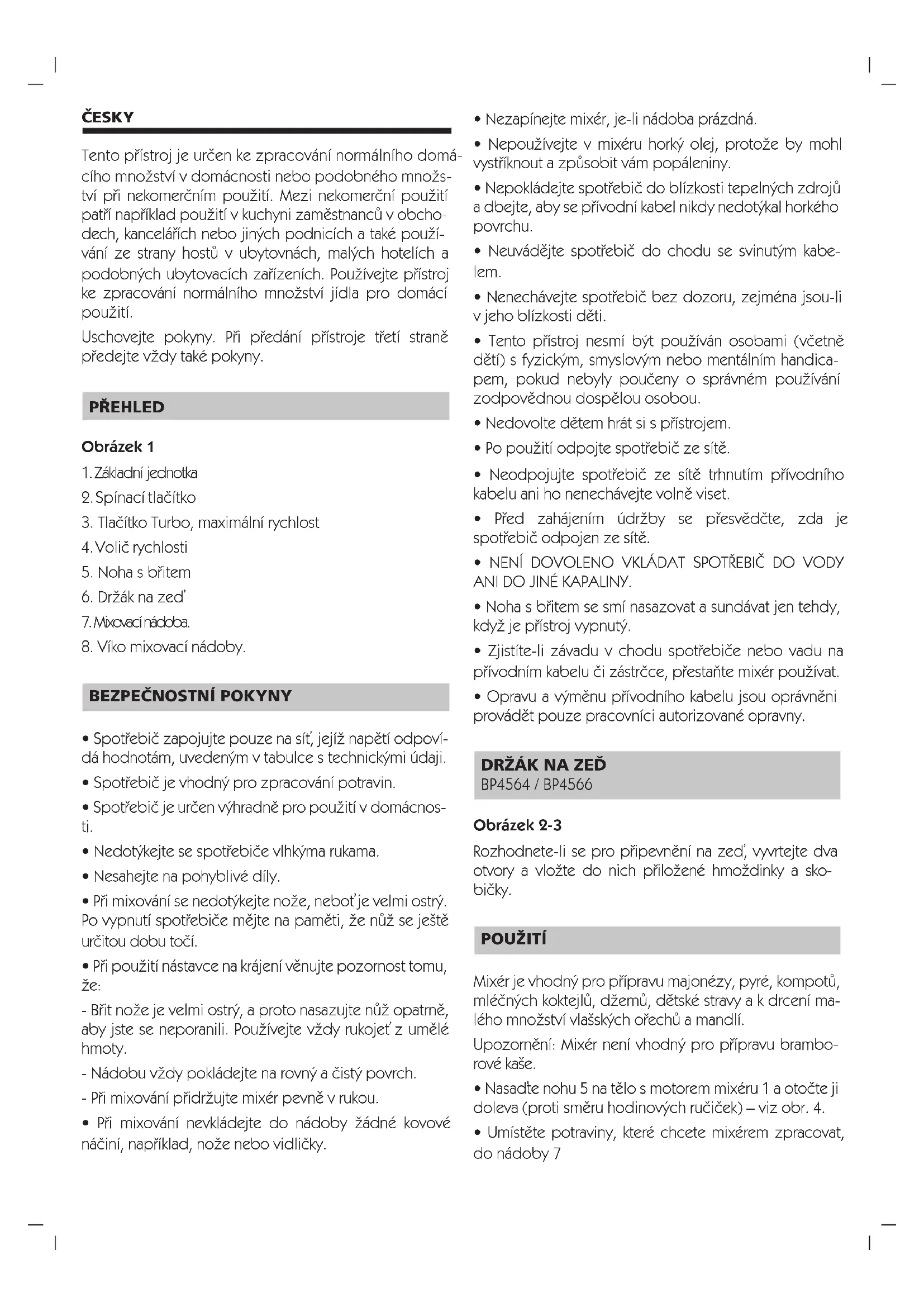 - Opravu a v˘mûnu pfiívodního kabelu jsou oprávnûni provádût pouze pracovníci autorizované opravny. DRÎÁK NA ZEë BP4564 / BP4566 Obrázek 2-3 Rozhodnete-li se pro pfiipevnûní na zeì, vyvrtejte dva otvory a vloÏte do nich pfiiloÏené hmoÏdinky a sko- biãky. POUÎITÍ Mixér je vhodn˘ pro pfiípravu majonézy, pyré, kompotÛ, mléãn˘ch koktejlÛ, dÏemÛ, dûtské stravy a k drcení ma- lého mnoÏství vla‰sk˘ch ofiechÛ a mandlí. Upozornûní: Mixér není vhodn˘ pro pfiípravu brambo- rové ka‰e.