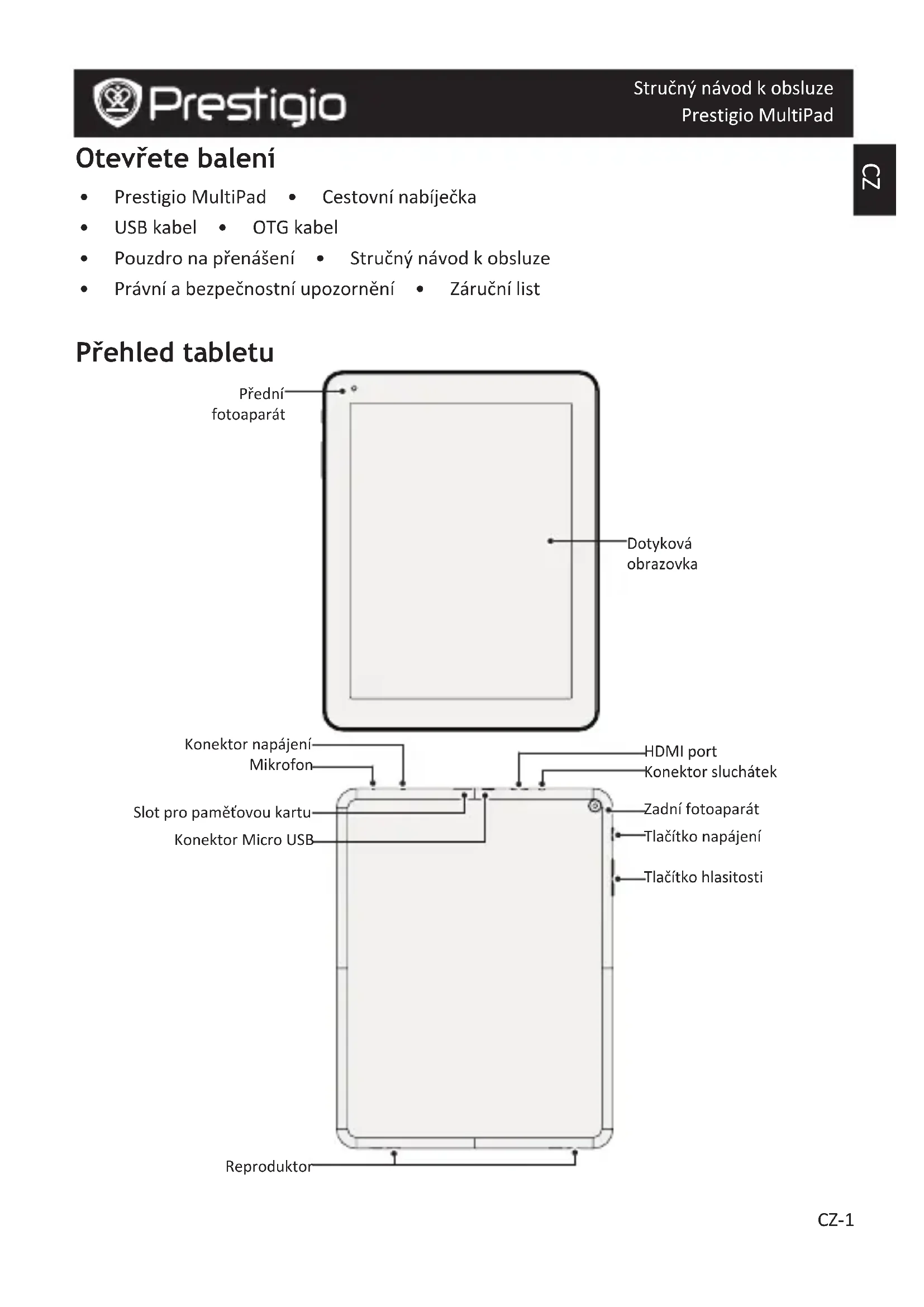 Stručný návod k obsluze Prestigio MultiPad Otevřete balení