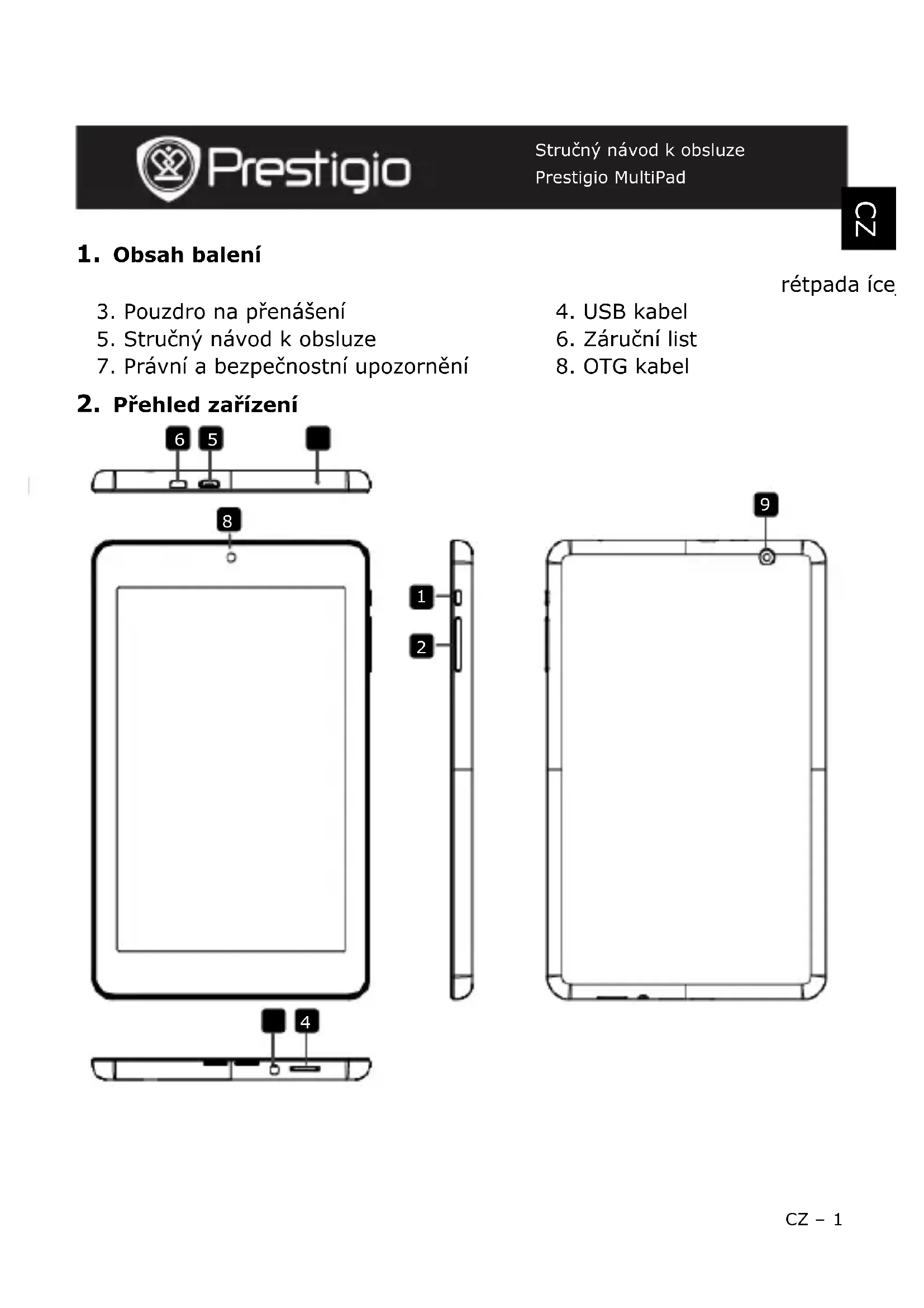 Správně NesprávněCZ – 4 Technické parametry Procesor Dvoujádrový ARM Cortex A9 na frekvenci až 1,6 GHz Paměť RAM 1GB DDR3 Displej 7" IPS panel, kapacitní multidotykový Rozlišení 1280 × 800 pixelů Video: AVI,3GP, MP4, RM, RMVB, FLV, MOV Audio:MP3/WMA/WAV/OGG/FLAC/APE/AAC Podporované formáty souborů Obrázky: JPEG (základní), BMP, GIF (statické), PNG Kapacita úložiště 8 GB paměti Flash (asi 6 GB přístupných uživateli), slot pro Micro SDHC karty podporuje karty o kapacitě až 32 GB Rozhraní USB 2.0, Micro SD (kompatibilní s Micro SDHC), USB Host Komunikace WiFi (802.11 b/g/n) Baterie 4000mAh Li-Pol baterie Rozměry 188×116×9,0 mm (D × Š × V) (přibl.) Hmotnost 310 g (přibl.) Provozní teplota 0 až +45 Zřeknutí se odpovědnosti Produkty od společnosti Prestigio jsou neustále aktualizovány a zlepšovány, takže se může vzhled vašeho zařízení a jeho funkce drobně lišit od toho, co je prezentováno v tomto Stručném návodu k obsluze. Společnost Prestigio tímto prohlašuje, že toto zařízení MultiPad vyhovuje základním požadavkům a dalším příslušným nařízením stanoveným směrnicí EU 1999/5/EC. Úplné znění prohlášení o shodě je k dispozici na adrese http://www.prestigio.com/compliance