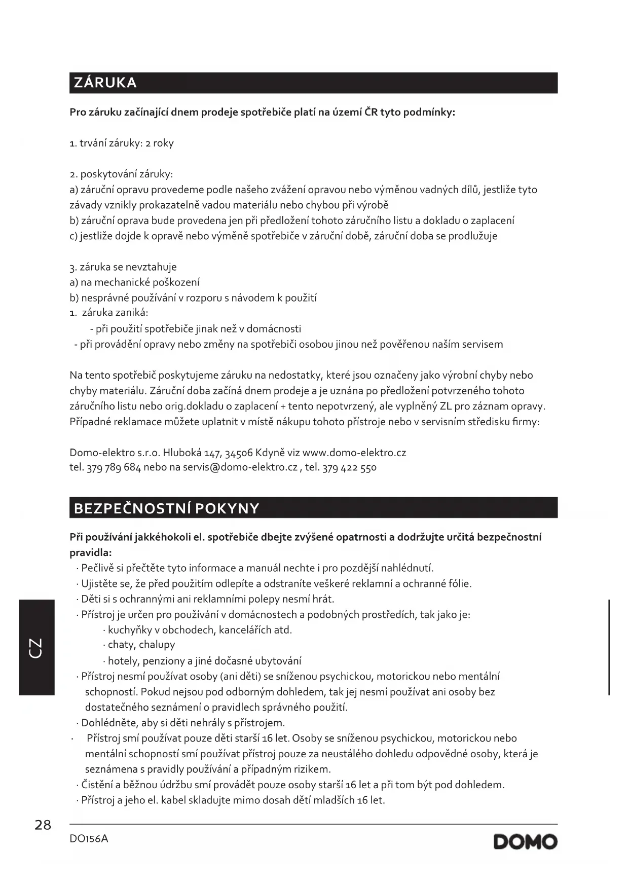 - při použití spotřebiče jinak než v domácnosti - při provádění opravy nebo změny na spotřebiči osobou jinou než pověřenou naším servisem Na tento spotřebič poskytujeme záruku na nedostatky, které jsou označeny jako výrobní chyby nebo chyby materiálu. Záruční doba začíná dnem prodeje a je uznána po předložení potvrzeného tohoto záručního listu nebo orig.dokladu o zaplacení + tento nepotvrzený, ale vyplněný ZL pro záznam opravy. Případné reklamace můžete uplatnit v místě nákupu tohoto přístroje nebo v servisním středisku rmy: Domo-elektro s.r.o. Hluboká 147, 34506 Kdyně viz www.domo-elektro.cz tel. 379 789 684 nebo na servis@domo-elektro.cz , tel. 379 422 550