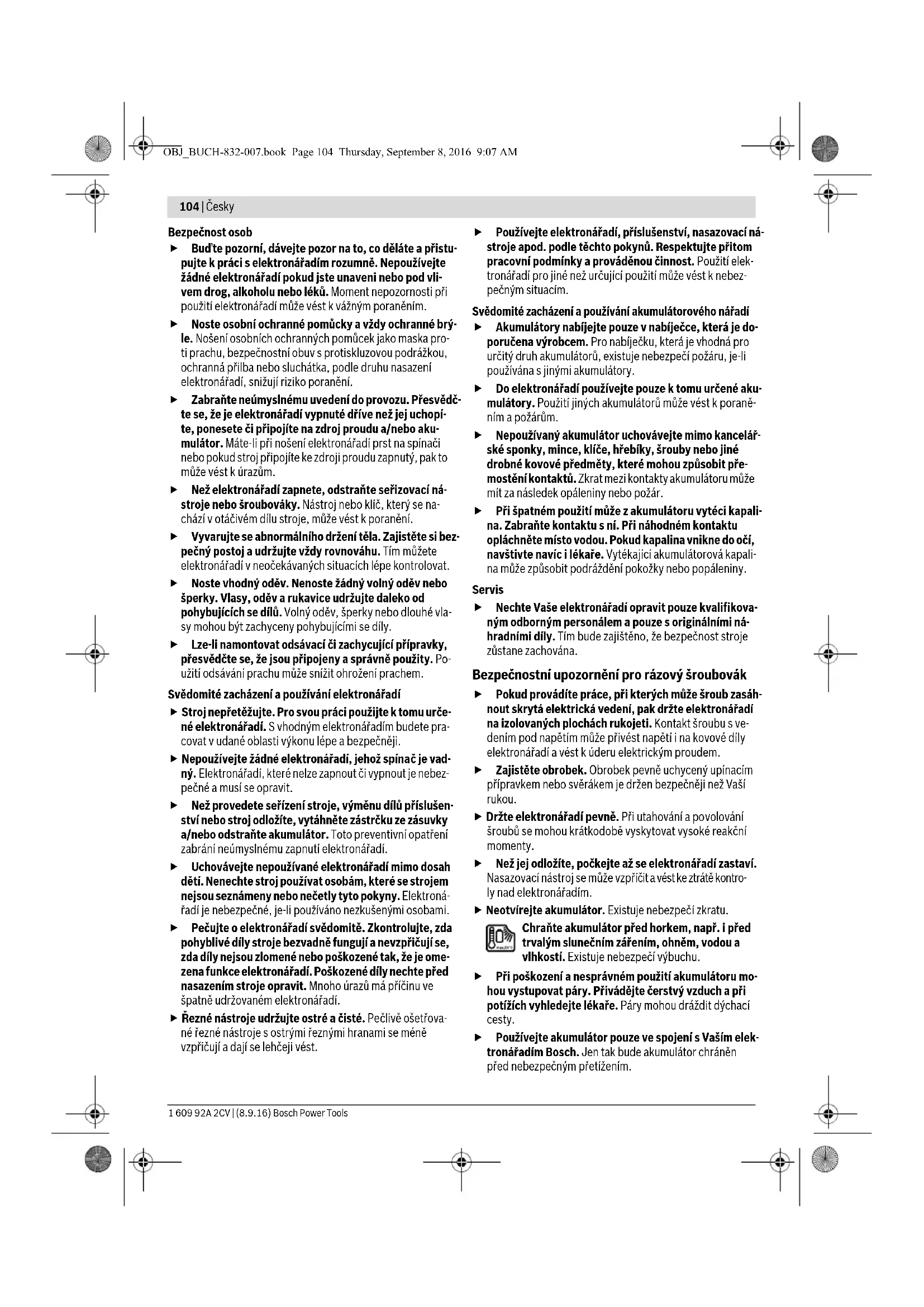 OBJ_BUCH-832-007.book Page 102 Thursday, September 8, 2016 9:07 AMČesky | 103 Bosch Power Tools 1 609 92A 2CV | (8.9.16) Transport Załączone w dostawie akumulatory litowo jonowe podlegają wymaganiom przepisów dotyczących towarów niebezpiecz- nych. Akumulatory mogą być transportowane drogą lądową przez użytkownika bez konieczności spełnienia jakichkolwiek dalszych warunków. W przypadku przesyłki przez osoby trzecie (np. transport dro- gą powietrzną lub za pośrednictwem firmy spedycyjnej) nale- ży dostosować się do szczególnych wymogów dotyczących opakowania i znaczenia towaru. W takim wypadku podczas przygotowywania towaru do wysyłki należy skonsultować się z ekspertem d/s towarów niebezpiecznych. Akumulatory można wysyłać tylko wówczas, gdy ich obudowa nie jest uszkodzona. Odsłonięte styki należy zakleić, a akumu- lator zapakować w taki sposób, aby nie mógł on się poruszać (przesuwać) w opakowaniu. Należy wziąć też pod uwagę ewentualne przepisy prawa krajo- wego. Usuwanie odpadów Elektronarzędzia, akumulatory, osprzęt i opakowanie należy oddać do powtórnego przetworzenia zgodne- go z obowiązującymi przepisami w zakresie ochrony środowiska. Elektronarzędzia i akumulatora/baterii nie wolno wyrzucać do odpadów domowych! Tylko dla państw należących do UE: Zgodnie z europejską wytyczną 2012/19/UE, niezdatne do użytku elektro- narzędzia, a zgodnie z europejską wytyczną 2006/66/WE uszkodzone lub zużyte akumulatory/baterie, należy zbierać osob- no i doprowadzić do ponownego przetwo- rzenia zgodnego z zasadami ochrony środo- wiska. Akumulatory/Baterie: Li-Ion: Proszę stosować się do wskazówek, znajdujących się w rozdziale „Trans- port“, str.103. Zastrzega się prawo dokonywania zmian. Česky Bezpečnostní upozornění Všeobecná varovná upozornění pro elektronářadí Čtěte všechna varovná upozornění a pokyny. Zanedbání při dodržování va- rovných upozornění a pokynů mohou mít za následek zásah elektrickým proudem, požár a/nebo těžká poranění. Všechna varovná upozornění a pokyny do budoucna uschovejte. Ve varovných upozorněních použitý pojem „elektronářadí“ se vztahuje na elektronářadí provozované na el. síti (se síťovým kabelem) a na elektronářadí provozované na akumulátoru (bez síťového kabelu). Bezpečnost pracovního místa Udržujte Vaše pracovní místo čisté a dobře osvětlené. Nepořádek nebo neosvětlené pracovní oblasti mohou vést k úrazům. S elektronářadím nepracujte v prostředí ohroženém explozí, kde se nacházejí hořlavé kapaliny, plyny nebo prach. Elektronářadí vytváří jiskry, které mohou prach ne- bo páry zapálit. Děti a jiné osoby udržujte při použití elektronářadí da- leko od Vašeho pracovního místa. Při rozptýlení můžete ztratit kontrolu nad strojem. Elektrická bezpečnost Připojovací zástrčka elektronářadí musí lícovat se zá- suvkou. Zástrčka nesmí být žádným způsobem uprave- na. Společně s elektronářadím s ochranným uzemně- ním nepoužívejte žádné adaptérové zástrčky. Neupra- vené zástrčky a vhodné zásuvky snižují riziko zásahu elek- trickým proudem. Zabraňte kontaktu těla s uzemněnými povrchy, jako např. potrubí, topení, sporáky a chladničky. Je-li Vaše tělo uzemněno, existuje zvýšené riziko zásahu elektrickým proudem. Chraňte stroj před deštěm a vlhkem. Vniknutí vody do elektronářadí zvyšuje nebezpečí zásahu elektrickým prou- dem. Dbejte na účel kabelu, nepoužívejte jej k nošení či zavě- šení elektronářadí nebo k vytažení zástrčky ze zásuv- ky. Udržujte kabel daleko od tepla, oleje, ostrých hran nebo pohyblivých dílů stroje. Poškozené nebo spletené kabely zvyšují riziko zásahu elektrickým proudem. Pokud pracujete s elektronářadím venku, použijte pou- ze takové prodlužovací kabely, které jsou způsobilé i pro venkovní použití. Použití prodlužovacího kabelu, jež je vhodný pro použití venku, snižuje riziko zásahu elektric- kým proudem. Pokud se nelze vyhnout provozu elektronářadí ve vlh- kém prostředí, použijte proudový chránič. Nasazení proudového chrániče snižuje riziko zásahu elektrickým proudem. VAROVÁNÍ OBJ_BUCH-832-007.book Page 103 Thursday, September 8, 2016 9:07 AM104 | Česky 1 609 92A 2CV | (8.9.16) Bosch Power Tools Bezpečnost osob Buďte pozorní, dávejte pozor na to, co děláte a přistu- pujte k práci s elektronářadím rozumně. Nepoužívejte žádné elektronářadí pokud jste unaveni nebo pod vli- vem drog, alkoholu nebo léků. Moment nepozornosti při použití elektronářadí může vést k vážným poraněním. Noste osobní ochranné pomůcky a vždy ochranné brý- le. Nošení osobních ochranných pomůcek jako maska pro- ti prachu, bezpečnostní obuv s protiskluzovou podrážkou, ochranná přilba nebo sluchátka, podle druhu nasazení elektronářadí, snižují riziko poranění. Zabraňte neúmyslnému uvedení do provozu. Přesvědč- te se, že je elektronářadí vypnuté dříve než jej uchopí- te, ponesete či připojíte na zdroj proudu a/nebo aku- mulátor. Máte-li při nošení elektronářadí prst na spínači nebo pokud stroj připojíte ke zdroji proudu zapnutý, pak to může vést k úrazům. Než elektronářadí zapnete, odstraňte seřizovací ná- stroje nebo šroubováky. Nástroj nebo klíč, který se na- chází v otáčivém dílu stroje, může vést k poranění. Vyvarujte se abnormálního držení těla. Zajistěte si bez- pečný postoj a udržujte vždy rovnováhu. Tím můžete elektronářadí v neočekávaných situacích lépe kontrolovat. Noste vhodný oděv. Nenoste žádný volný oděv nebo šperky. Vlasy, oděv a rukavice udržujte daleko od pohybujících se dílů. Volný oděv, šperky nebo dlouhé vla- sy mohou být zachyceny pohybujícími se díly. Lze-li