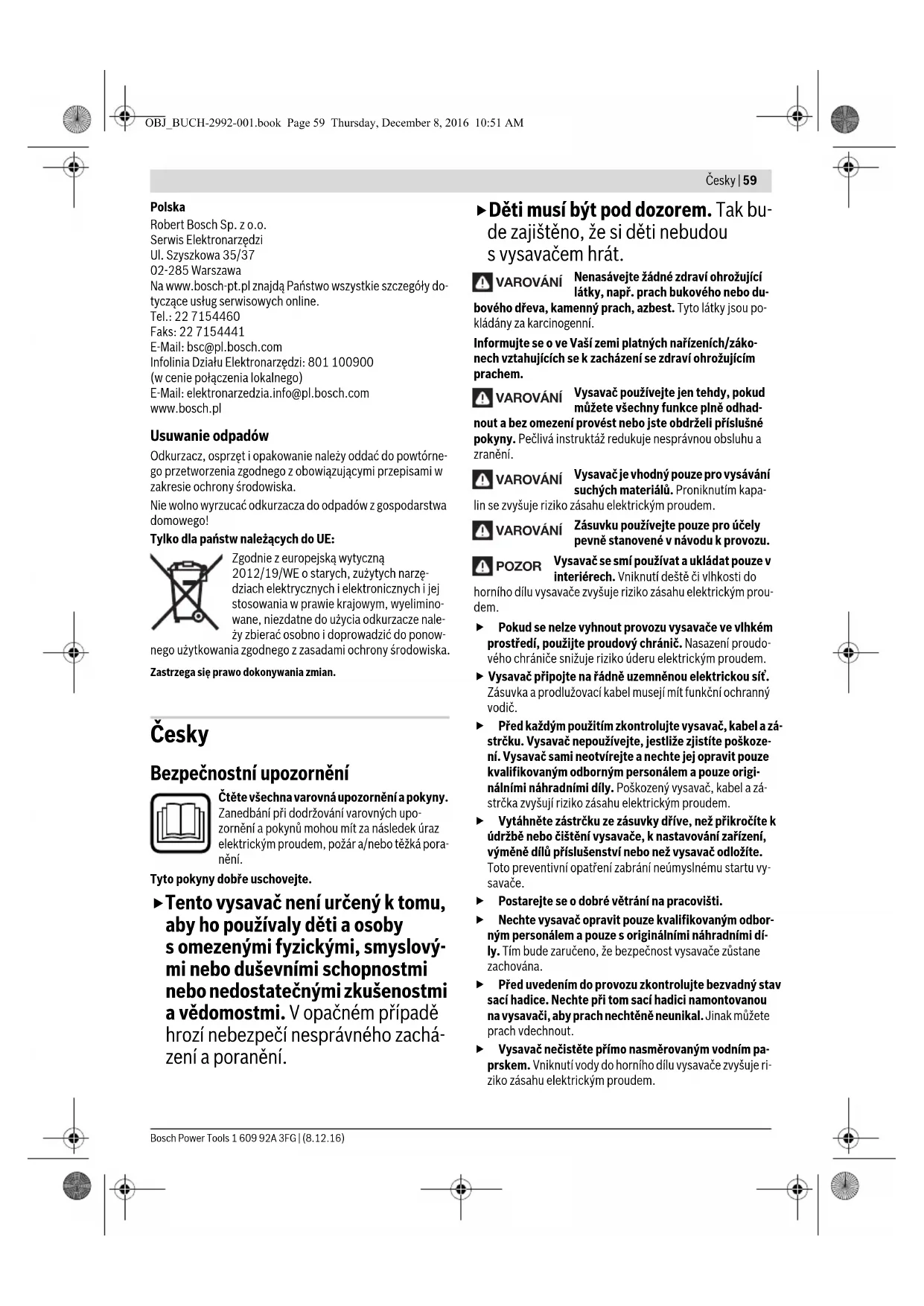 ního dovoleného příkonu připojeného elektronářadí. – Namontujte odsávací adaptér 12 (viz „Montáž odsávacího adaptéru nebo zahnuté hubice“, strana 61). – Nasaďte odsávací adaptér 12 na odsávací hrdlo elektrické- ho nářadí. Upozornění: Při práci s elektrickým nářadím, u něhož se do sací hadice přivádí malé množství vzduchu (např. kmitací pily, brusky), musí být otvor falešného vzduchu 20 na sací hadici 10 otevřený. Díky tomu se zlepší celkový výkon vysavače aelektrického nářadí. Za tímto účelem otočte kroužek nad otvorem falešného vzdu- chu 20 tak, aby vznikl maximální otvor. –Pro uvedení vysavače do provozu zapněte elektronářadí připojené do zásuvky 4. Vysavač se automaticky nastartu- je. – Elektronářadí vypněte, aby se odsávání ukončilo. Doběhová funkce start/stop automatiky až 6 sekund dobí- há, aby se ze sací hadice odsál zbytkový prach. Údržba a servis Údržba a čištění Před všemi pracemi na vysavači vytáhněte síťovou zá- strčku ze zásuvky. Udržujte vysavač a větrací otvory čisté, abyste praco- vali dobře a bezpečně. Je-li nutné nahrazení přívodního kabelu, pak to nechte kvůli zamezení ohrožení bezpečnosti provést firmou Bosch nebo autorizovaným servisem pro elektronářadí Bosch. Čištění filtrační jednotky (viz obr. E1–E3) – Stiskněte odjišťovací tlačítko 8 a vytáhněte z vysavače box na prach 9. – Vyjměte textilní filtr 21 společně s mřížkou filtru a textilní filtr vykartáčujte měkkým kartáčem. – Plochý skládaný filtr 22 uchopte za výstupky a vyjměte ho společně s mřížkou filtru. Plochý skládaný filtr vykartáčujte měkkým kartáčem nebo ho opláchněte pod tekoucí vodou a poté ho nechte důklad- ně uschnout. – Vyčištěné filtry znovu nasaďte a dbejte přitom na bezpeč- né a správné usazení. –Pro zapnutí vysavače nastavte přepínač vol- by druhu provozu 2 na symbol „sání“. –Pro vypnutí vysavače nastavte přepínač vol- by druhu provozu 2 na symbol „vypnutí“. –Pro spuštění start/stop automatiky vysavače nastavte přepínač volby druhu provozu 2 na symbol „start/stop automatika“. –Pro vypnutí vysavače nastavte přepínač vol- by druhu provozu 2 na symbol „vypnutí“. OBJ_BUCH-2992-001.book Page 61 Thursday, December 8, 2016 10:51 AM62 | Slovensky 1 609 92A 3FG | (8.12.16) Bosch Power Tools Čištění boxu na prach –Box na prach 9 čas od času vytřete běžně prodávaným ne- abrazivním čisticím prostředkem a poté ho nechte důklad- ně uschnout. Čištění trvalého filtru (viz obr. F) Občas vyčistěte trvalý filtr 24, abyste zachovali optimální vý- konnost vysavače. – Otevřete kryt výstupního vzduchu 23 a vyjměte trvalý filtr