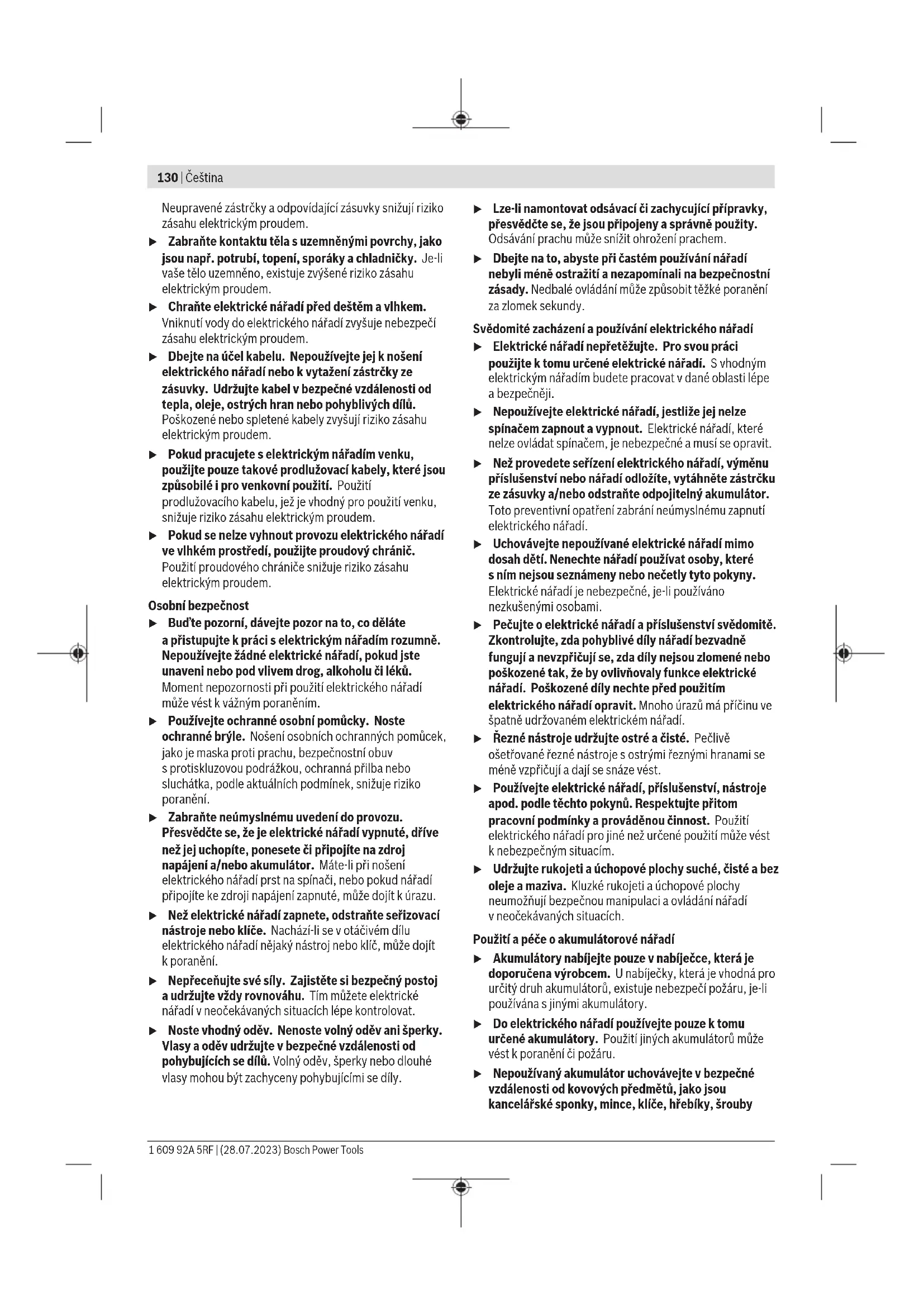 Úroveň vibrací aúroveň hluku, které jsou uvedené vtěchto pokynech, byly změřeny pomocí normované měřicí metody alze je použít pro vzájemné porovnání elektronářadí. Hodí se ipro předběžný odhad zatížení vibracemi ahlukem. Uvedená úroveň vibrací aúroveň hluku reprezentuje hlavní použití elektronářadí. Pokud se ovšem bude elektronářadí používat pro jiné práce, sjinými nástroji nebo snedostatečnou údržbou, může se úroveň hluku aúroveň vibrací lišit. To může zatížení vibracemi ahlukem po celou pracovní dobu zřetelně zvýšit. Pro přesný odhad zatížení vibracemi ahlukem by měly být zohledněny idoby, kdy je nářadí vypnuté nebo běží, ale ve skutečnosti se nepoužívá. To může zatížení vibracemi ahlukem po celou pracovní dobu výrazně snížit. Stanovte dodatečná bezpečnostní opatření kochraně obsluhy před účinky vibrací, jako je např. údržba elektronářadí anástrojů, udržování teplých rukou, organizace pracovních procesů. Akumulátor Bosch prodává akumulátorové elektrické nářadí ibez akumulátoru. Na obale je uvedené, zda je součástí dodávky elektrického nářadí akumulátor. Nabíjení akumulátoru u Používejte pouze nabíječky uvedené vtechnických údajích. Jen tyto nabíječky jsou přizpůsobené pro lithium-iontový akumulátor používaný svaším elektronářadím. Upozornění: Lithium-iontové akumulátory se na základě mezinárodních dopravních předpisů dodávají částečně nabité. Aby byl zaručen plný výkon akumulátoru, před prvním použitím akumulátor úplně nabijte. Nasazení akumulátoru Vložte nabitý akumulátor do uchycení akumulátoru tak, aby citelně zaskočil. Vyjmutí akumulátoru Pro vyjmutí akumulátoru stiskněte odjišťovací tlačítka avytáhněte akumulátor. Nepoužívejte přitom násilí. Ukazatel stavu nabití akumulátoru Tři zelené LED ukazatele stavu nabití akumulátoru indikují stav nabití akumulátoru. Ukazatel stavu nabití akumulátoru svítí pouze 3s po zapnutí. LED Kapacita Trvale svítí 3 zelené 60–100% Trvale svítí 2 zelené 30–60% Trvale svítí 1 zelená 5–30% Bliká 1 zelená 0–5% Ochrana proti přetížení závislá na teplotě Pokud se nářadí používá vsouladu surčeným účelem, nemůže dojít kjeho přetížení. Při příliš velkém zatížení nebo mimo přípustný teplotní rozsah akumulátoru se sníží otáčky nebo se elektronářadí vypne. Vpřípadě snížení otáček se elektronářadí rozběhne znovu na plné otáčky až po dosažení přípustné teploty akumulátoru nebo po omezení zatížení. Vpřípadě automatického vypnutí elektronářadí vypněte, nechte akumulátor vychladnout aelektronářadí znovu zapněte. Ukazatel kontroly teploty/přetížení Červený LED ukazatel pomáhá chránit akumulátor před přehřátím amotor před přetížením. Pokud svítí LED ukazatel trvale červeně, je teplota akumulátoru příliš vysoká aelektrické nářadí se automaticky vypne. – Vypněte elektrické nářadí. – Než budete dále pracovat, nechte akumulátor vychladnout. Pokud bliká LED ukazatel červeně, je elektrické nářadí zablokované aautomaticky se vypne. Vytáhněte elektrické nářadí zobrobku. Jakmile zablokování odstraníte, pracuje elektrické nářadí dál. 1 609 92A 5RF | (28.07.2023) Bosch Power ToolsČeština | 135 Upozornění pro optimální zacházení s akumulátorem Akumulátor chraňte před vlhkostí a vodou. Akumulátor skladujte pouze v teplotním rozmezí od −20 °C do 50 °C. Nenechávejte akumulátor ležet např. v létě v autě. Výrazně kratší doba chodu po nabití ukazuje, že je akumulátor opotřebovaný a musí se vyměnit. Dodržujte pokyny pro likvidaci. Montáž Montáž ochranného zařízení u Před každou prací na elektronářadí (např. údržba, výměna nástrojů) apři jeho přepravě auskladnění vyjměte akumulátor. Při neúmyslném stisknutí vypínače hrozí nebezpečí poranění. Upozornění: Po prasknutí brusného kotouče během provozu nebo při poškození upínacích přípravků na ochranném krytu/ na elektronářadí se musí elektronářadí neprodleně zaslat zákaznickému servisu, adresy viz část „Zákaznická aporadenská služba“. Ochranný kryt pro broušení u Při broušení používejte vždy ochranný kryt pro broušení(7). Ochranný kryt pro dělení u Při dělení používejte vždy ochranný kryt pro dělení(10). u Při dělení kamene zajistěte dostatečné odsávání prachu. Montáž ochranného krytu (viz obrázek A) Ochranný kryt pro dělení (10) nasaďte na ochranný kryt pro broušení (7) tak, aby pevně zaskočil. Nastavení ochranného krytu (viz obrázek A) Otočte ochranný kryt do požadované polohy anechte ho zaskočit. Není ktomu nutný žádný nástroj. u Ochranný kryt (7) nastavte tak, aby jiskry nelétaly směrem kpracovníkovi. Montáž brusných nástrojů u Před každou prací na elektronářadí (např. údržba, výměna nástrojů) apři jeho přepravě auskladnění vyjměte akumulátor. Při neúmyslném stisknutí vypínače hrozí nebezpečí poranění. u Nedotýkejte se brusných arozbrušovacích kotoučů, dokud nevychladnou. Kotouče se při práci silně zahřívají. Vyčistěte brusné vřeteno (8) avšechny díly, které budete montovat. Pro upnutí nebo povolení brusných nástrojů posuňte aretační tlačítko vřetena (2) dopředu azároveň otáčejte brusným nástrojem, aby se brusné vřeteno zajistilo. u Aretační tlačítko vřetena ovládejte, jen když je brusné vřeteno zastavené. Jinak se může elektronářadí poškodit. Brusný/dělicí kotouč Dbejte na rozměry brusných nástrojů. Průměr otvoru musí odpovídat upínací přírubě. Nepoužívejte adaptéry ani redukce. Při používání diamantových dělicích kotoučů dbejte na to, aby