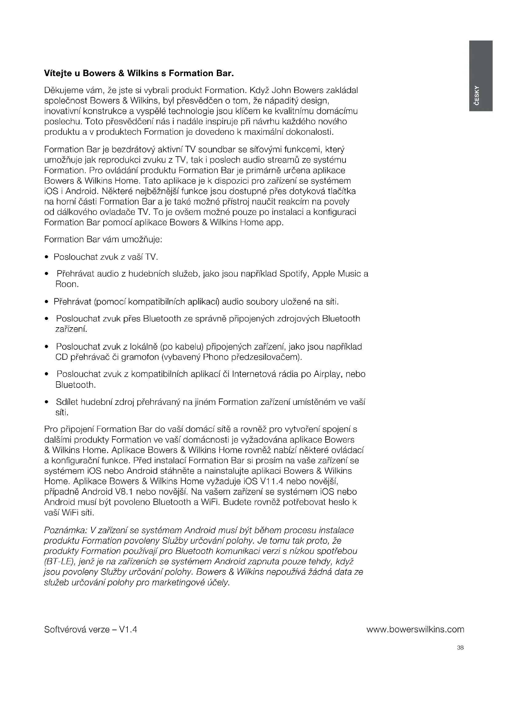 - Sdílet hudební zdroj přehrávaný na jiném Formation zařízení umístěném ve vaší síti. Pro připojení Formation Bar do vaší domácí sítě a rovněž pro vytvoření spojení s dalšími produkty Formation ve vaší domácnosti je vyžadována aplikace Bowers & Wilkins Home. Aplikace Bowers & Wilkins Home rovněž nabízí některé ovládací a kongurační funkce. Před instalací Formation Bar si prosím na vaše zařízení se systémem iOS nebo Android stáhněte a nainstalujte aplikaci Bowers & Wilkins Home. Aplikace Bowers & Wilkins Home vyžaduje iOS V11.4 nebo novější, případně Android V8.1 nebo novější. Na vašem zařízení se systémem iOS nebo Android musí být povoleno Bluetooth a WiFi. Budete rovněž potřebovat heslo k vaší WiFi síti. Poznámka: V zařízení se systémem Android musí být během procesu instalace produktu Formation povoleny Služby určování polohy. Je tomu tak proto, že produkty Formation používají pro Bluetooth komunikaci verzi s nízkou spotřebou (BT-LE), jenž je na zařízeních se systémem Android zapnuta pouze tehdy, když jsou povoleny Služby určování polohy. Bowers & Wilkins nepoužívá žádná data ze služeb určování polohy pro marketingové účely. Softvérová verze – V1.4 ČESKY Contents ČESKY 1