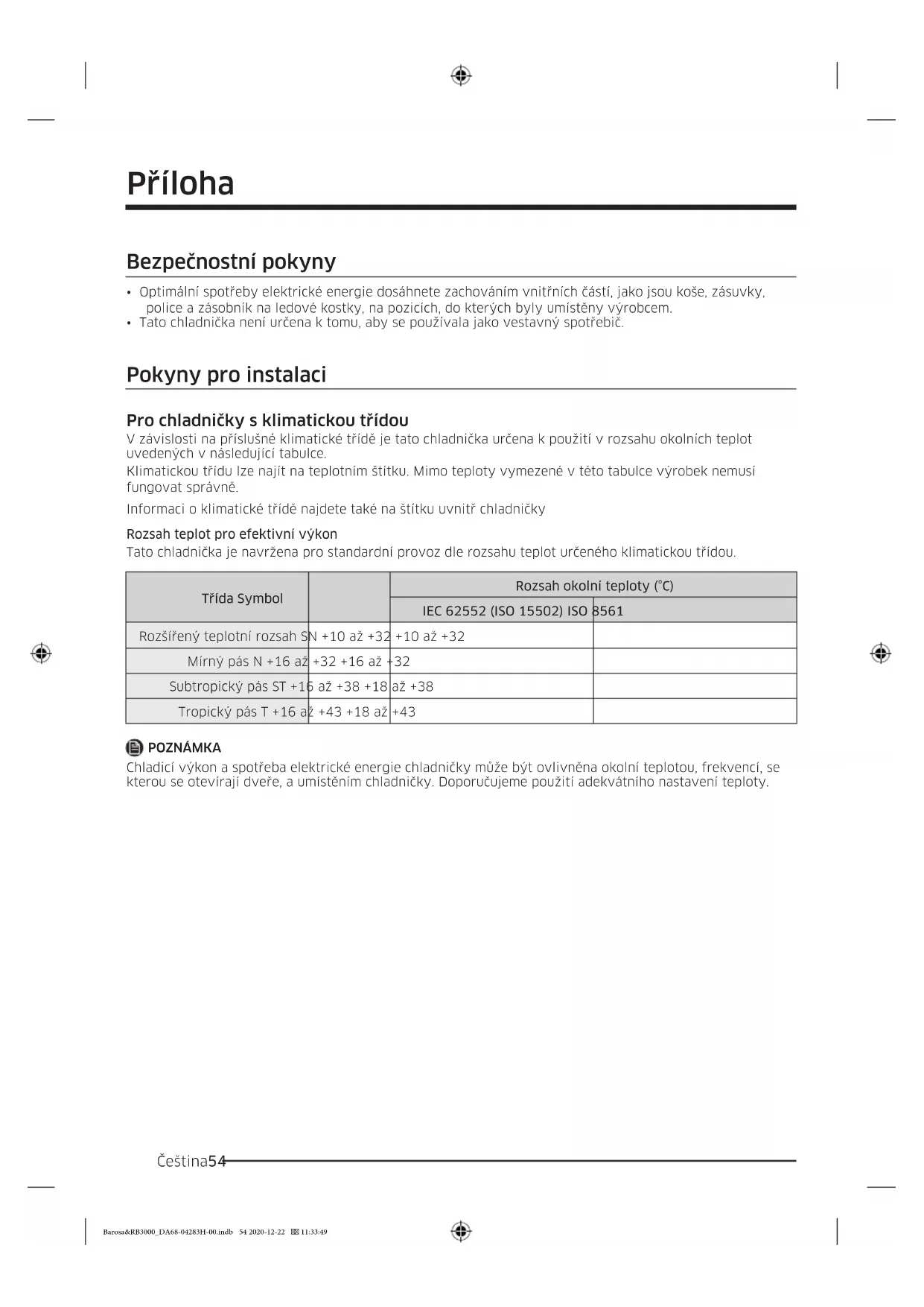 Rozšířený teplotní rozsah SN +10 až +32 +10 až +32 Mírný pás N +16 až +32 +16 až +32 Subtropický pás ST +16 až +38 +18 až +38 Tropický pás T +16 až +43 +18 až +43 POZNÁMKA Chladicí výkon a spotřeba elektrické energie chladničky může být ovlivněna okolní teplotou, frekvencí, se kterou se otevírají dveře, a umístěním chladničky. Doporučujeme použití adekvátního nastavení teploty. Barosa&RB3000_DA68-04283H-00.indb 54 2020-12-22 11:33:49Čeština 55 Pokyny ohledně teploty Doporučená teplota Optimální nastavení teploty pro skladování potravin:
