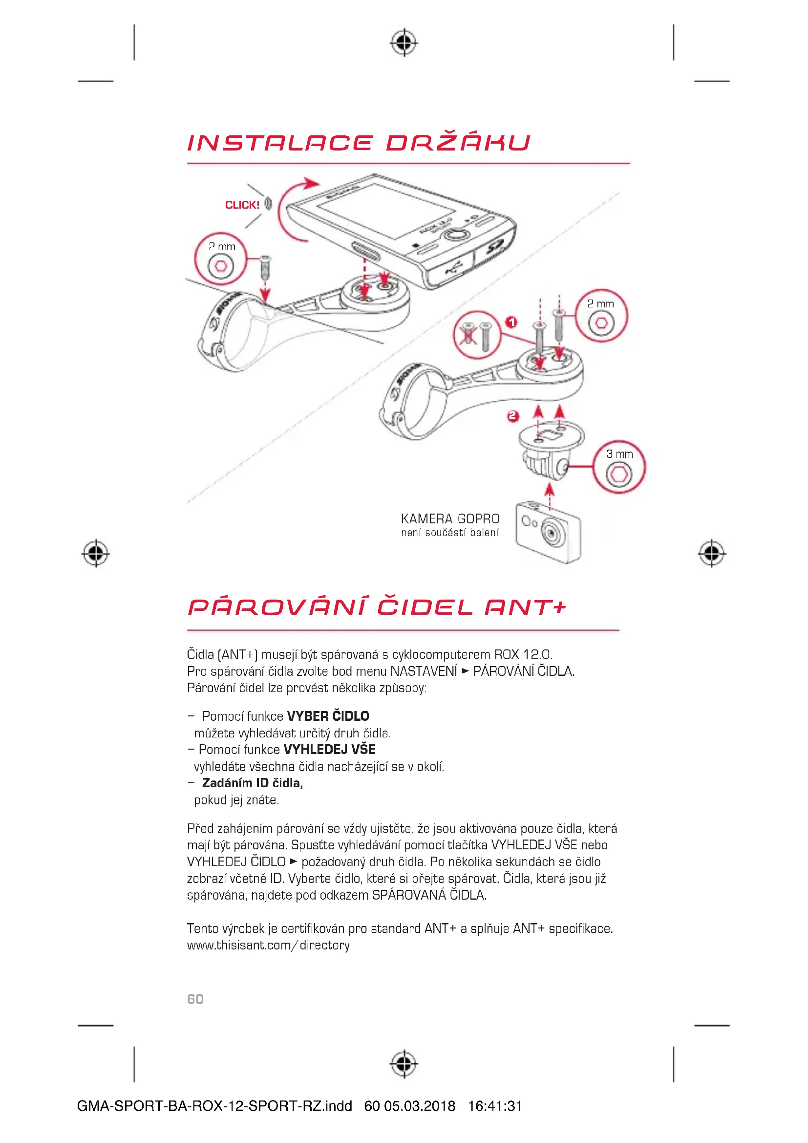 Čidla (ANT+) musejí být spárovaná scyklocomputerem ROX 12.0. Pro spárování čidla zvolte bod menu NASTAVENÍ ► PÁROVÁNÍ ČIDLA. Párování čidel lze provést několika způsoby: − Pomocí funkce VYBER ČIDLO můžete vyhledávat určitý druh čidla. − Pomocí funkce VYHLEDEJ VŠE vyhledáte všechna čidla nacházející se v okolí. − Zadáním ID čidla, pokud jej znáte. Před zahájením párování se vždy ujistěte, že jsou aktivována pouze čidla, která mají být párována. Spusťte vyhledávání pomocí tlačítka VYHLEDEJ VŠE nebo VYHLEDEJ ČIDLO ► požadovaný druh čidla. Po několika sekundách se čidlo zobrazí včetně ID. Vyberte čidlo, které si přejte spárovat. Čidla, která jsou již spárována, najdete pod odkazem SPÁROVANÁ ČIDLA. Tento výrobek je certifikován pro standard ANT+ a splňuje ANT+ specifikace. www.thisisant.com/directory SIGMA-SPORT-BA-ROX-12-SPORT-RZ.indd 60 05.03.2018 16:41:31CZ