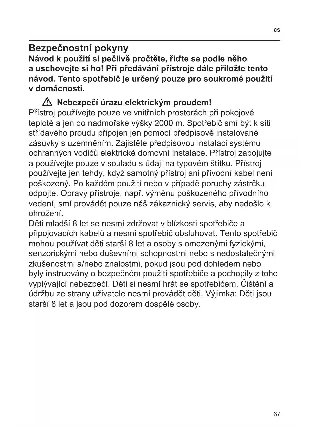 Bezpečnostní pokyny Návod k použití si pečlivě pročtěte, řiďte se podle něho a uschovejte si ho! Při předávání přístroje dále přiložte tento návod. Tento spotřebič je určený pouze pro soukromé použití v domácnosti. W Nebezpečí úrazu elektrickým proudem! Přístroj používejte pouze ve vnitřních prostorách při pokojové teplotě a jen do nadmořské výšky 2000 m. Spotřebič smí být k síti střídavého proudu připojen jen pomocí předpisově instalované zásuvky s uzemněním. Zajistěte předpisovou instalaci systému ochranných vodičů elektrické domovní instalace. Přístroj zapojujte a používejte pouze v souladu s údaji na typovém štítku. Přístroj používejte jen tehdy, když samotný přístroj ani přívodní kabel není poškozený. Po každém použití nebo v případě poruchy zástrčku odpojte. Opravy přístroje, např. výměnu poškozeného přívodního vedení, smí provádět pouze náš zákaznický servis, aby nedošlo k ohrožení. Děti mladší 8 let se nesmí zdržovat v blízkosti spotřebiče a připojovacích kabelů a nesmí spotřebič obsluhovat. Tento spotřebič mohou používat děti starší 8 let a osoby s omezenými fyzickými, senzorickými nebo duševními schopnostmi nebo s nedostatečnými zkušenostmi a/nebo znalostmi, pokud jsou pod dohledem nebo byly instruovány o bezpečném použití spotřebiče a pochopily z toho vyplývající nebezpečí. Děti si nesmí hrát se spotřebičem. Čištění a údržbu ze strany uživatele nesmí provádět děti. Výjimka: Děti jsou starší 8 let a jsou pod dozorem dospělé osoby.68