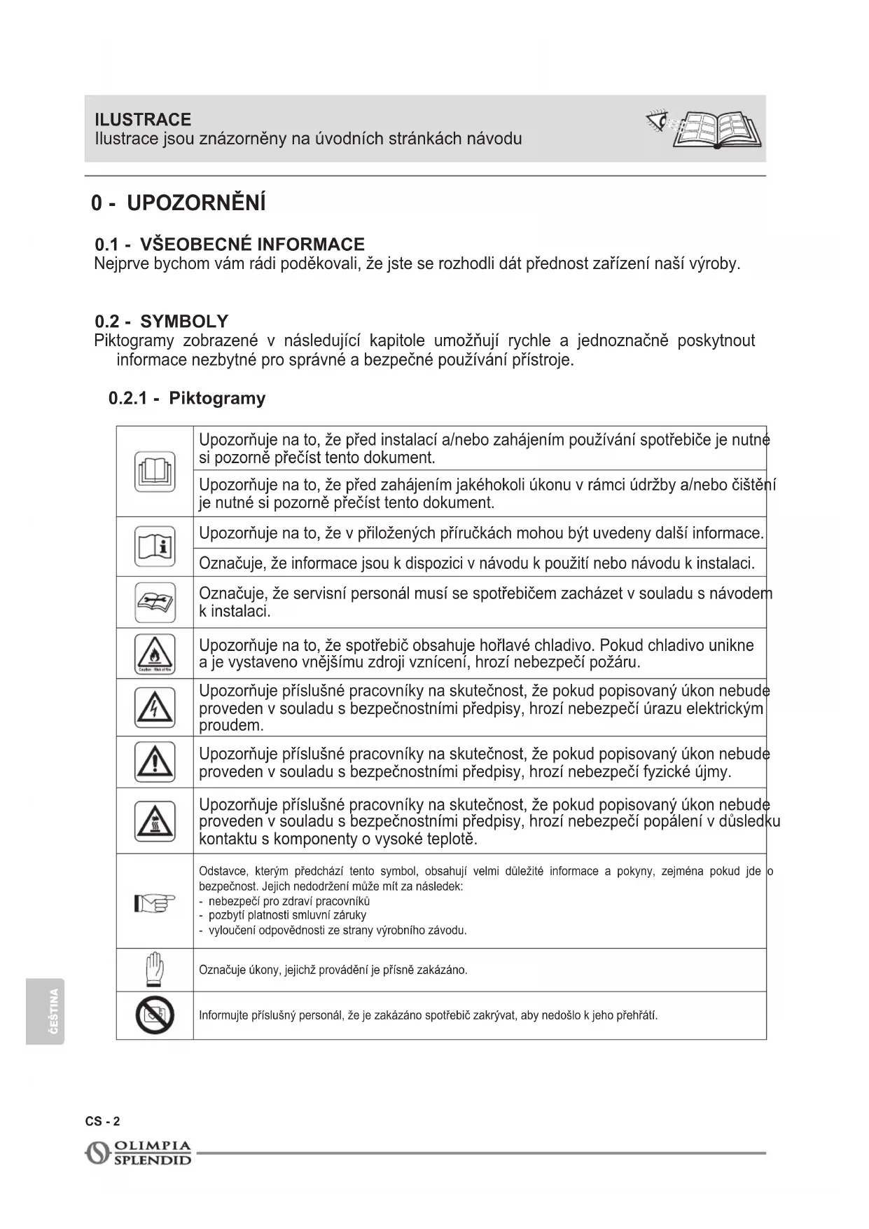 souhlasu společnosti OLIMPIA SPLENDID je zakázáno jeho kopírování nebo poskytování třetím osobám. Spotřebiče mohou být přepracovány, a proto mohou obsahovat díly odlišné od zobrazených komponentů, aniž by byly dotčeny texty obsažené v této příručce.