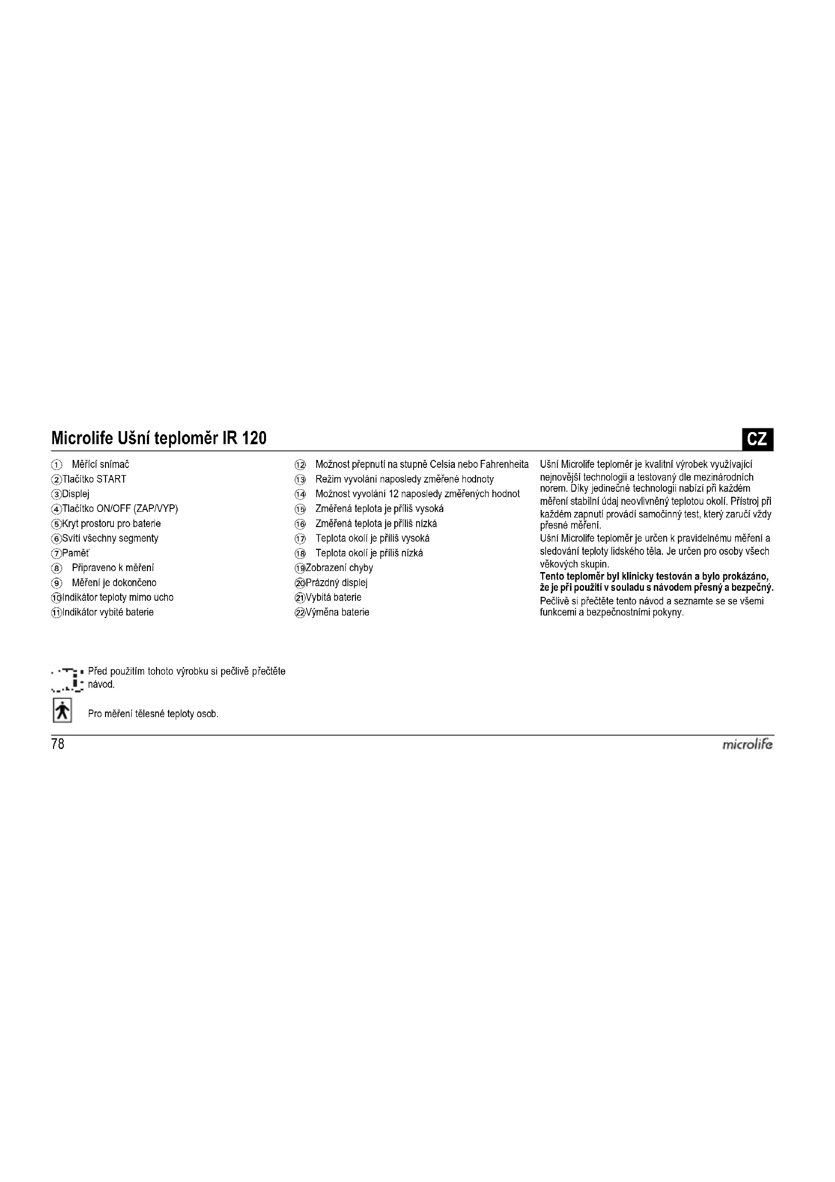 Před použitím tohoto výrobku si pečlivě přečtěte návod. Pro měření tělesné teploty osob. Ušní Microlife teploměr je kvalitní výrobek využívající nejnovější technologii a testovaný dle mezinárodních norem. Díky jedinečné technologii nabízí při každém měření stabilní údaj neovlivněný teplotou okolí. Přístroj při každém zapnutí provádí samočinný test, který zaručí vždy přesné měření. Ušní Microlife teploměr je určen k pravidelnému měření a sledování teploty lidského těla. Je určen pro osoby všech věkových skupin. Tento teploměr byl klinicky testován a bylo prokázáno, že je při použití v souladu s návodem přesný a bezpečný. Pečlivě si přečtěte tento návod a seznamte se se všemi funkcemi a bezpečnostními pokyny. Microlife Ušní teploměr IR 120