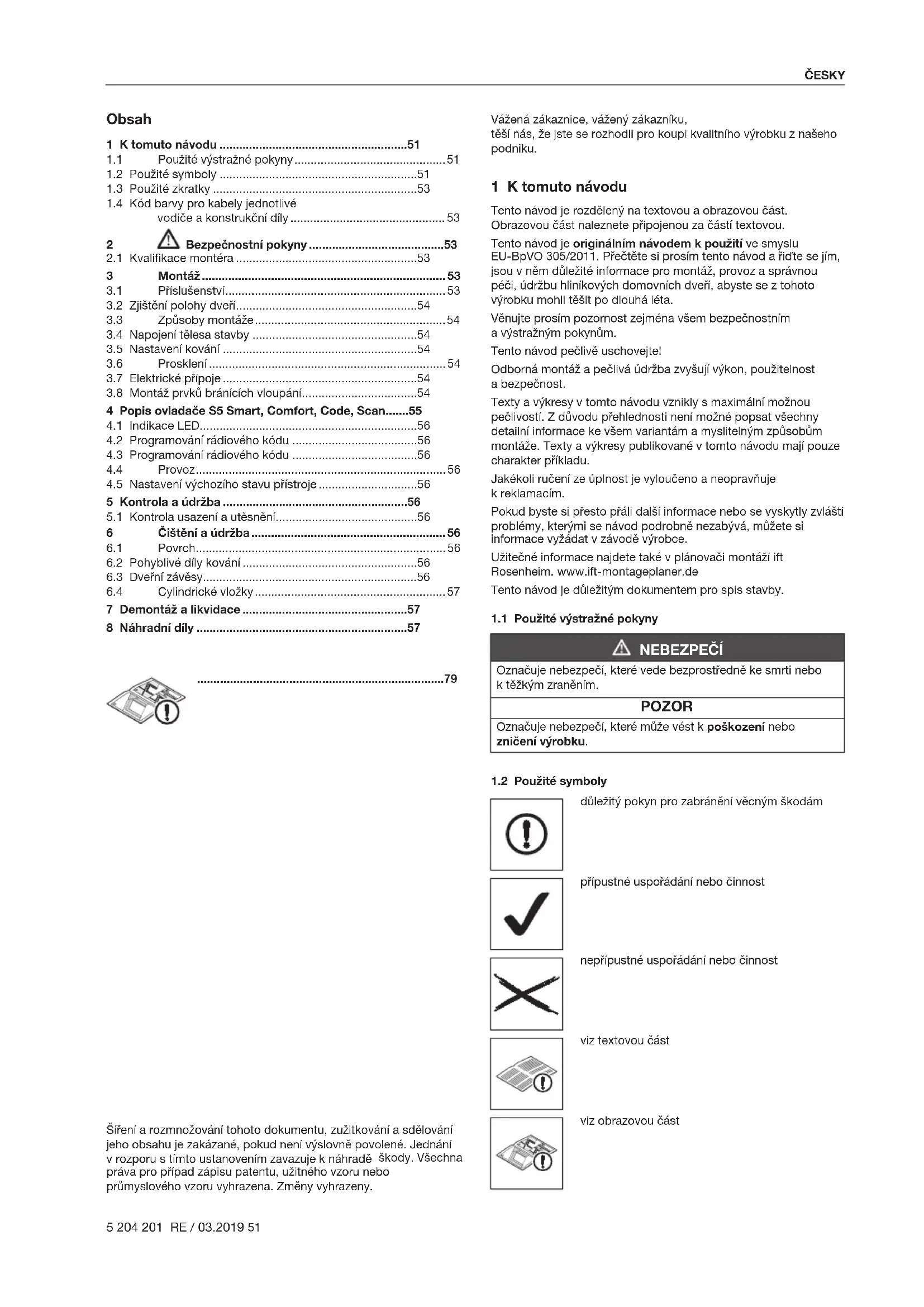 5 204 201 RE / 03.2019 51 ČESKYviz zvláštní návod k montáži řídicí jednotky, popřípadě přídavných elektrických obslužných prvků elektrické napětí volitelné konstrukční díly, k objednání jako příslušenství dveře jednokřídlé dveře s bočním dílem Dveře s otvíráním dovnitř Dveře s otvíráním ven nosné špalíky rozpěrné špalíky Vyrovnejte rám podle křídla interiér domu nepřípustné podle normy DIN4108 venkovní oblast domu zima léto rosení parotěsné paropropustné šroubový spoj ručně dotáhnout šroubový spoj pevně dotáhnout kontrola bezúdržbové odstavit křídlo dveří odstranění a likvidace konstrukčního dílu nebo obalu označuje v obrazové části pracovní kroky, které je nutné provést jeden po druhém konstrukční díl bránící vloupání RC3 podleDINEN1627:2011