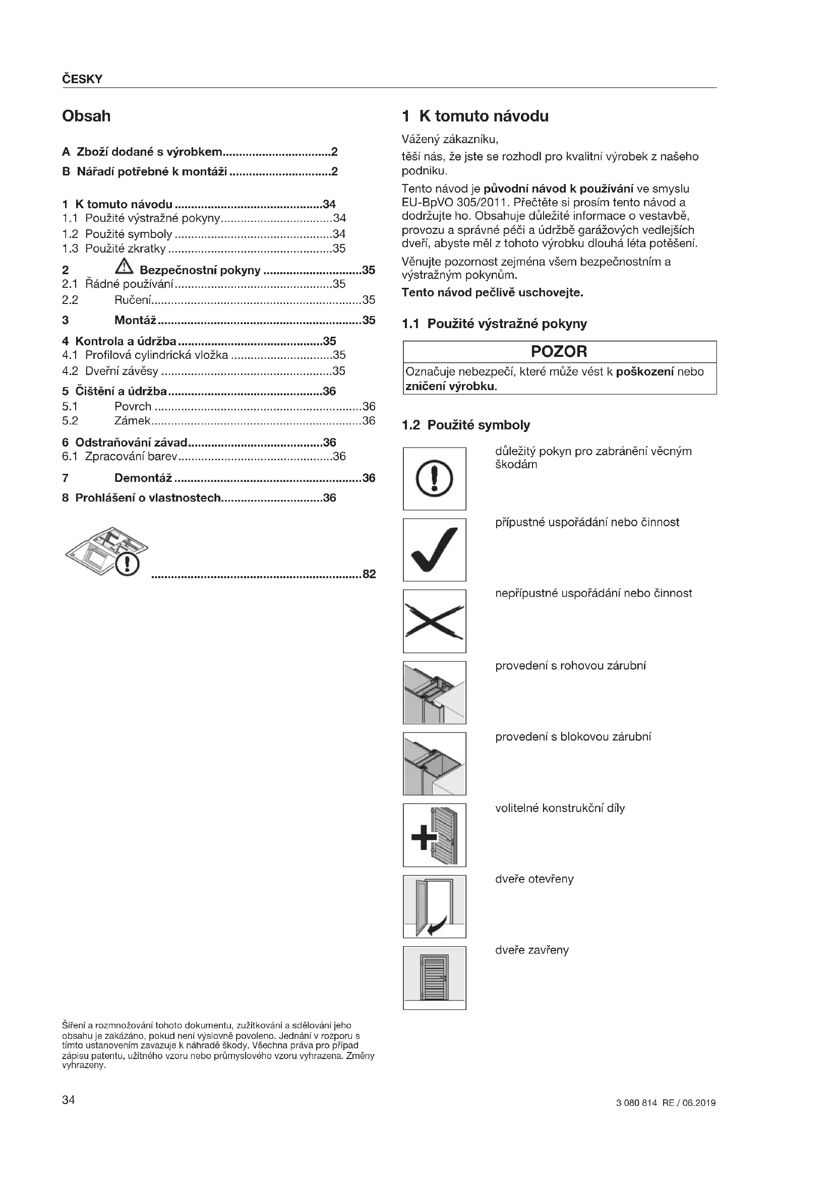 důležitý pokyn pro zabránění věcným škodám přípustné uspořádání nebo činnost nepřípustné uspořádání nebo činnost provedení s rohovou zárubní provedení s blokovou zárubní volitelné konstrukční díly dveře otevřeny dveře zavřeny 1 K tomuto návodu .............................................34
