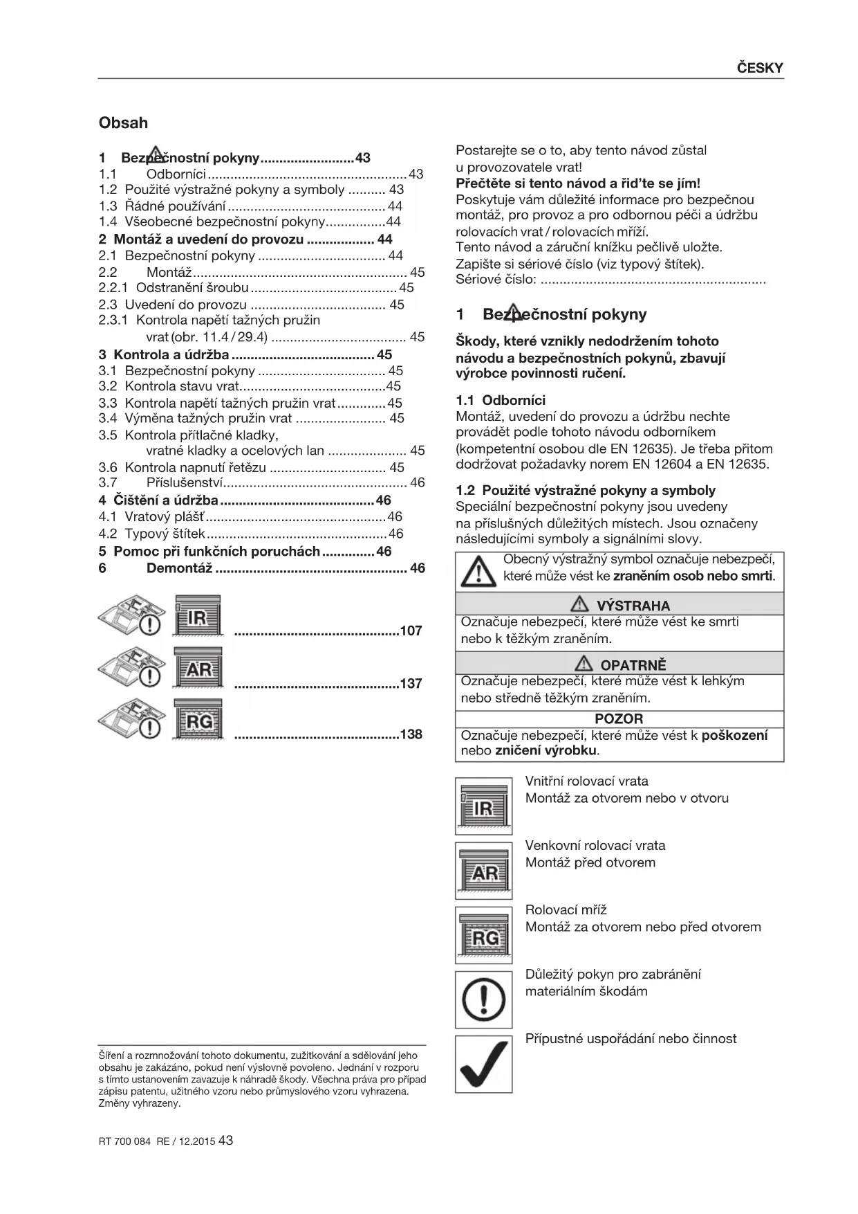 5 Pomoc při funkčních poruchách .............. 46 6 Demontáž ................................................... 46 Postarejte se o to, aby tento návod zůstal uprovozovatele vrat! Přečtěte si tento návod a řid’te se jím! Poskytuje vám důležité informace pro bezpečnou montáž, pro provoz a pro odbornou péči a údržbu rolovacích vrat / rolovacích mříží. Tento návod azáruční knížku pečlivě uložte. Zapište si sériové číslo (viz typový štítek). Sériové číslo: ............................................................ 1 Bezpečnostní pokyny Škody, které vznikly nedodržením tohoto návoduabezpečnostních pokynů, zbavují výrobcepovinnosti ručení.