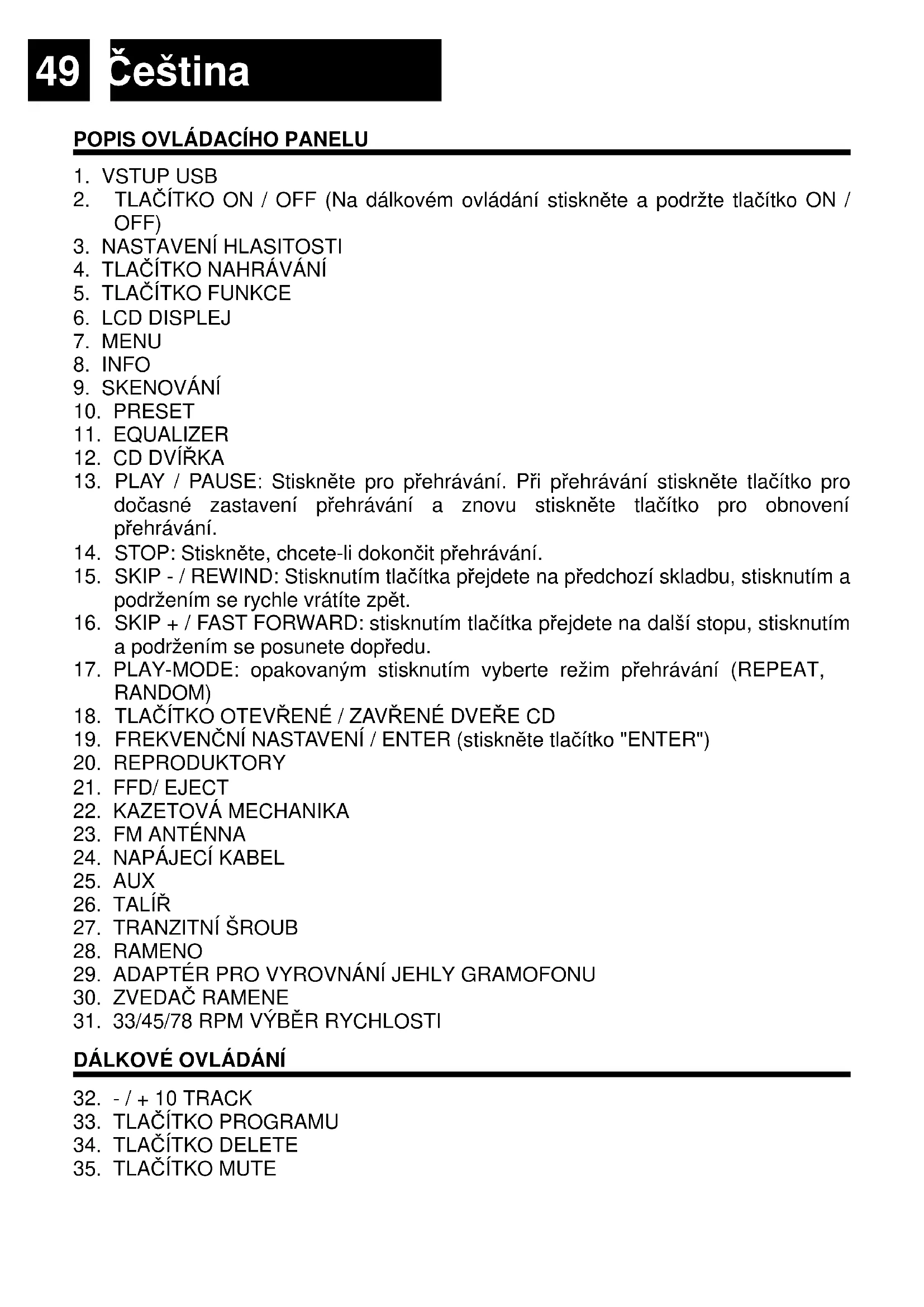 17. PLAY-MODE: opakovaným stisknutím vyberte režim přehrávání (REPEAT,