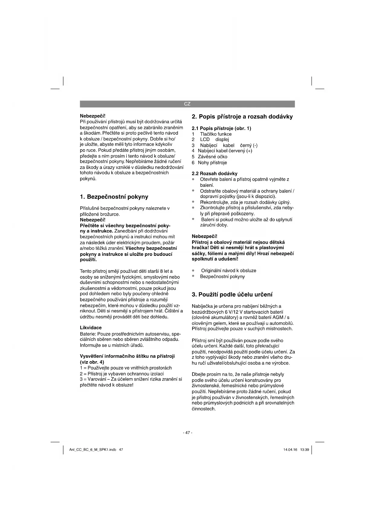 Nabíječka je určena pro nabíjení běžných a bezúdržbových 6 V/12 V startovacích baterií (olověné akumulátory) a rovněž baterií AGM / s olověným gelem, které se používají u automobilů. Přístroj používejte pouze v suchých místnostech. Přístroj smí být používán pouze podle svého účelu určení. Každé další, toto překračující použití, neodpovídá použití podle účelu určení. Za z toho vyplývající škody nebo zranění všeho dru- hu ručí uživatel/obsluhující osoba a ne výrobce. Dbejte prosím na to, že naše přístroje nebyly podle svého účelu určení konstruovány pro živnostenské, řemeslnické nebo průmyslové použití. Nepřebíráme proto žádné ručení, pokud je přístroj používán v živnostenských, řemeslných nebo průmyslových podnicích a při srovnatelných činnostech. Anl_CC_BC_6_M_SPK1.indb 47Anl_CC_BC_6_M_SPK1.indb 47 14.04.16 13:3914.04.16 13:39CZ