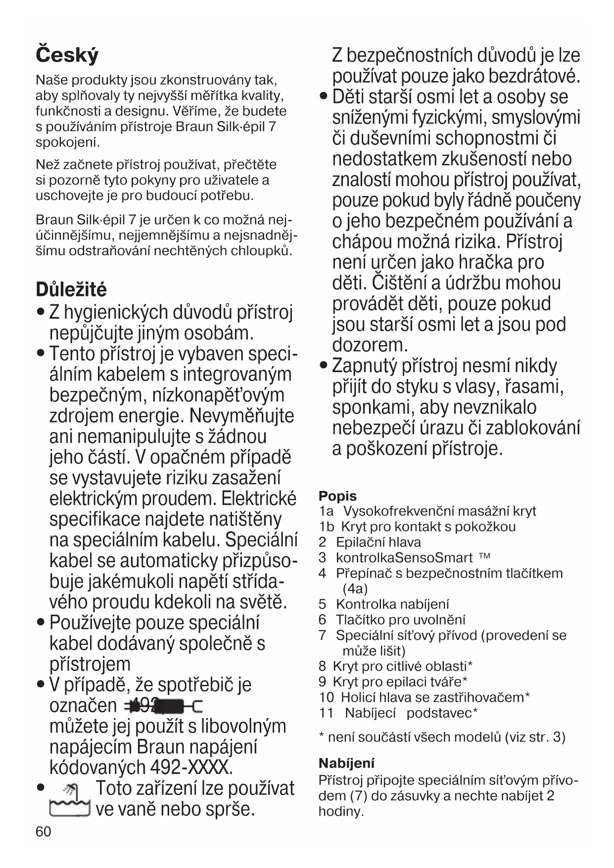 towar konsumpcyjny nie wyłącza, nie ogranicza ani nie zawiesza uprawnień Kupującego wynikających z przepisów o rękojmi za wady rzeczy sprzedanej. 91392805_SES_7_890_880_870_860_700_JUNO_S6-124.indd 5991392805_SES_7_890_880_870_860_700_JUNO_S6-124.indd 59 06.06.17 11:1006.06.17 11:10 CSS APPROVED Effective Date 6Jun2017 GMT - Printed 30Aug2017 Page 59 of 12460 Český Naše produkty jsou zkonstruovány tak, aby splňovaly ty nejvyšší měřítka kvality, funkčnosti a designu. Věříme, že budete s používáním přístroje Braun Silk·épil 7 spokojení. Než začnete přístroj používat, přečtěte si pozorně tyto pokyny pro uživatele a uschovejte je pro budoucí potřebu. Braun Silk·épil 7 je určen k co možná nej- účinnějšímu, nejjemnějšímu a nejsnadněj- šímu odstraňování nechtěných chloupků. Důležité