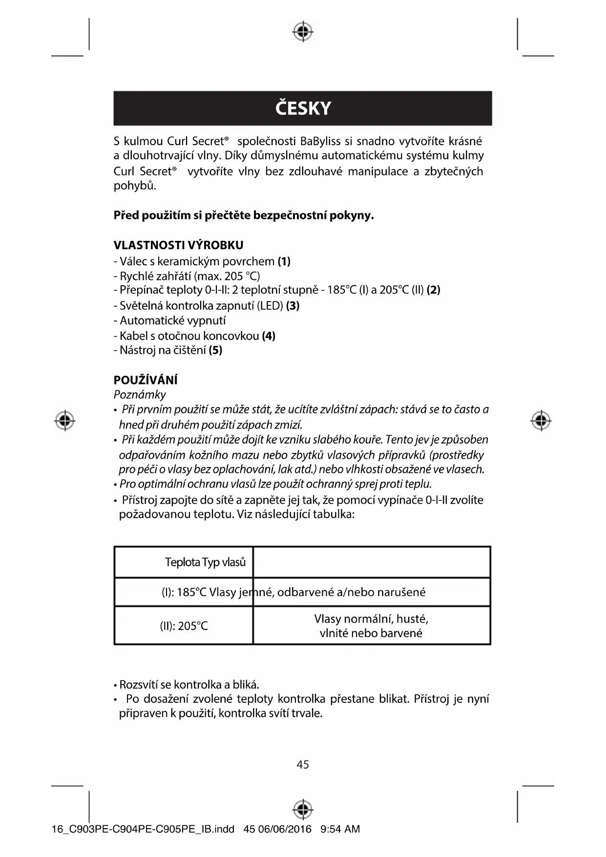 - Po dosažení zvolené teploty kontrolka přestane blikat. Přístroj je nyní připraven k použití, kontrolka svítí trvale. 16_C903PE-C904PE-C905PE_IB.indd 45 06/06/2016 9:54 AM46 Bezpečnostní pokyny k používání