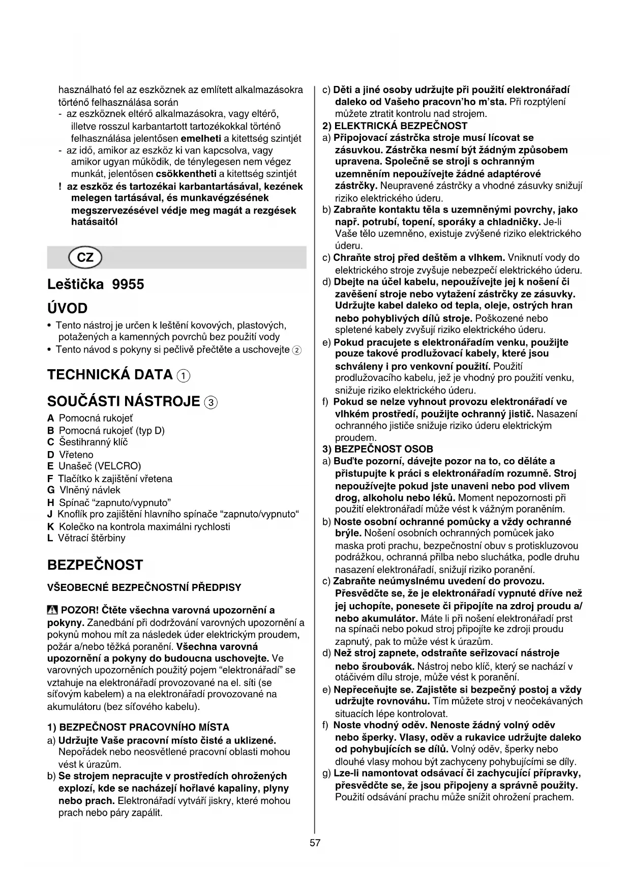 a) Toto elektrónárádi se používa jako leštička. Dbejte vsech varovnych upozorněni,Pokynú, zobrazení a udajú, jež jste s elektrónárádím obdrželi.Pokud následujici pokyny nedodržite, muže to vest k Úderu elektrickým proudem, požáru nebo tězkým poraněním.