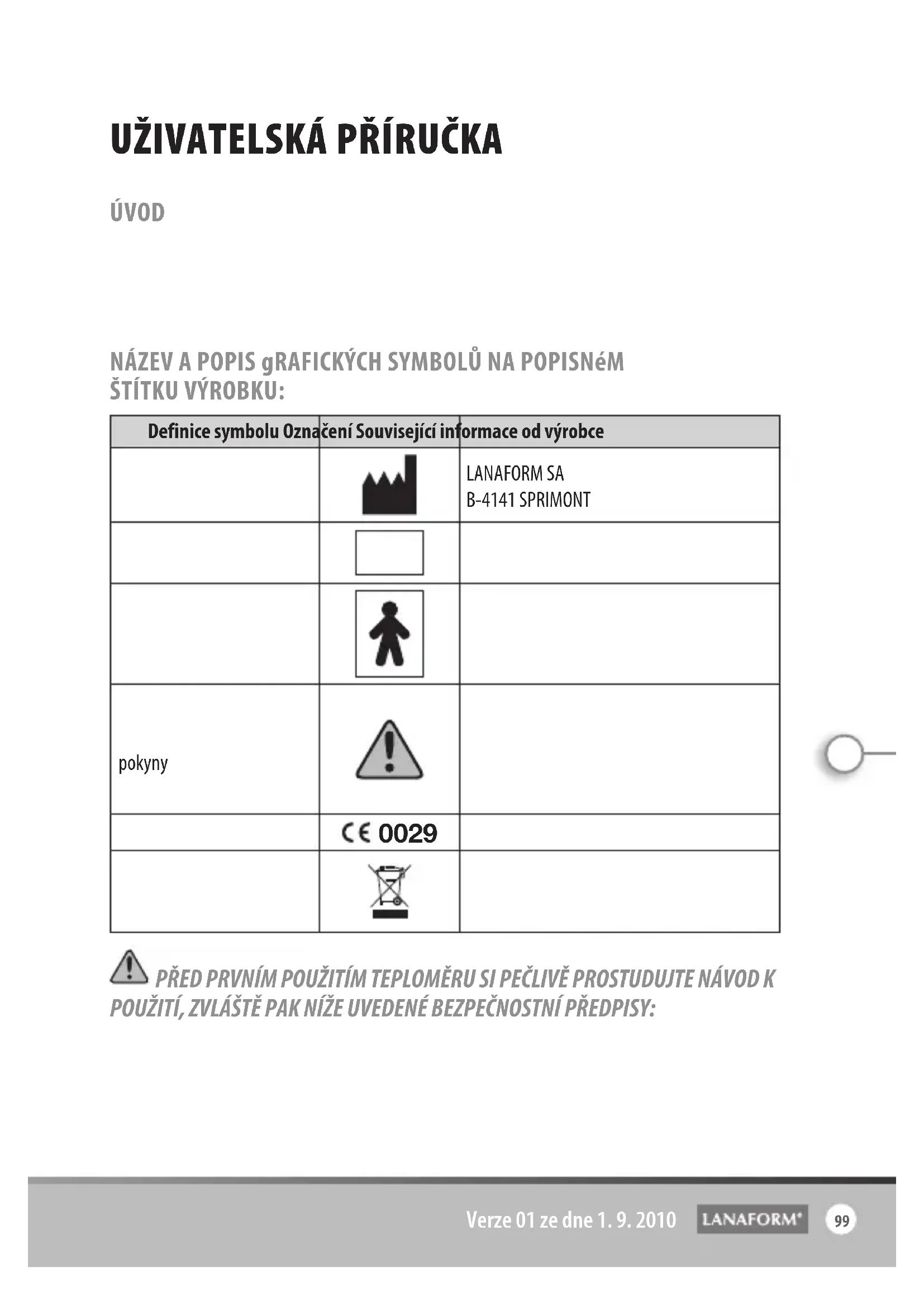 2010/10/2001 01CZ užIvatelská příručka ÚVOD Děkujeme vám za zakoupení „TEPLOMĚRU 4 v 1“ od společnosti LANAFORM®.Tento ušní a čelní teploměr od společnosti LANAFORM provádí přesné měření teploty díky infračervené technologii, kterou je toto zařízení vybaveno. NÁZEV A POPIS gRAFICKÝCH SYMBOLŮ NA POPISNéM ŠTÍTKU VÝROBKU: Definice symbolu Označení Související informace od výrobceÚdaje o výrobciLANAFORM SAB-4141 SPRIMONTČíslo šaržeLOTZařízení typu BFPozor, viz poznámka s pokynyPozor, odkazujeme vás na přiložené dokumenty. Před prvním použitím si pozorně přečtěte následující pokyny. Tyto instrukce musí být dodržovány i při každém dalším použití.Notifikovaný orgán Odpad z elektrických a elektronických zařízení (OEEZ) PŘED PRVNÍM POUŽITÍM TEPLOMĚRU SI PEČLIVĚ PROSTUDUJTE NÁVOD K POUŽITÍ, ZVLÁŠTĚ PAK NÍŽE UVEDENÉ BEZPEČNOSTNÍ PŘEDPISY: