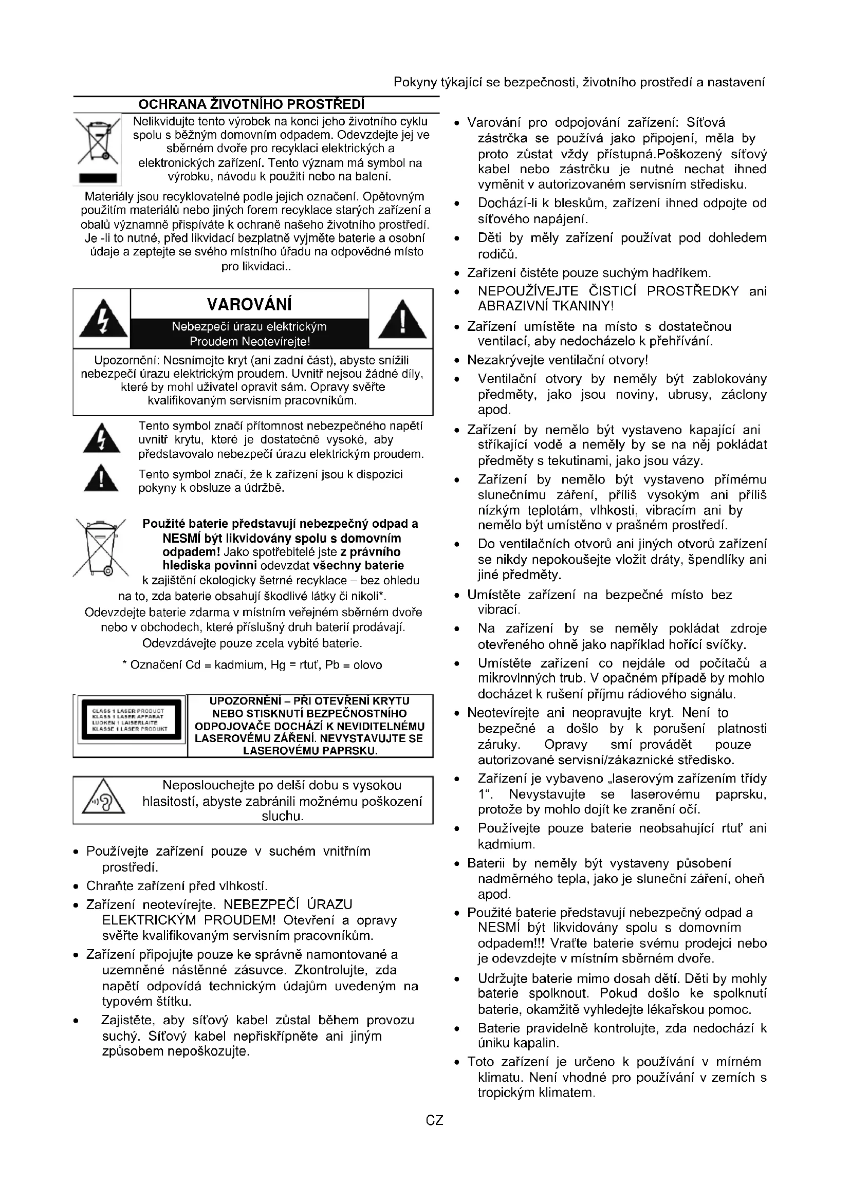 Umistete zarizeni co nejdale od poçaitaču a mikrovlnnych trab. V opacném pripadé by mohlo docházet k ruşeni prijmu rádoveho signalu. - Neotevírejte ani neopravujte kryt. Neni to bezpečné a doslo by k porušení platnosti záruky. Opravy smi provadět pouze autorizované servisí/zákaznické středisko.