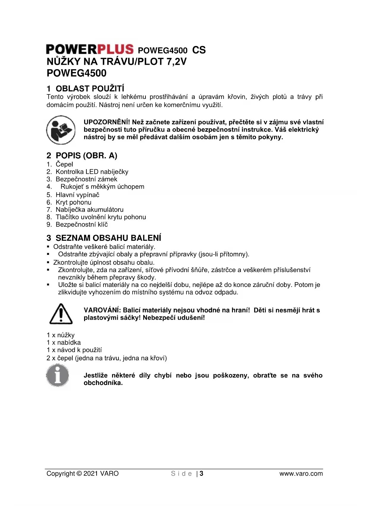 - Nabíječku akumulátorů, kabel a zástrčku kontrolujte před každým použitím. Nabíječku akumulátorů nepoužívejte, když jste na ní shledali poškození. Neotevírejte sami nabíječku akumulátorů a dávejte ji do opravy jen kvalifikovanému personálu, který používá originální náhradní díly. Poškozené nabíječky akumulátorů, kabely a zástrčky zvyšují riziko zasažení elektrickým proudem.POWEG4500 CS Copyright © 2021 VARO S i d e | 7 www.varo.com