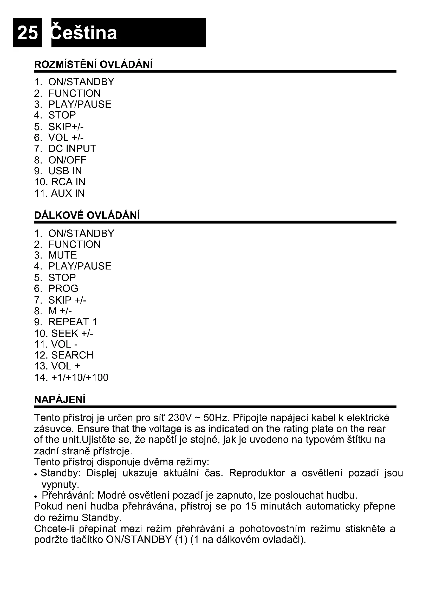 NAPÁJENÍ Tento pístroj je určen pro síť 230V ~ 50Hz. Pipojte napájecí kabel k elektrické zásuvce. Ensure that the voltage is as indicated on the rating plate on the rear of the unit.Ujistěte se, že napětí je stejné, jak je uvedeno na typovém štítku na zadní straně pístroje. Tento pístroj disponuje dvěma režimy: Standby: Displej ukazuje aktuální čas. Reproduktor a osvětlení pozadí jsou vypnuty. Pehrávání: Modré osvětlení pozadí je zapnuto, lze poslouchat hudbu. Pokud není hudba pehrávána, pístroj se po 15 minutách automaticky pepne do režimu Standby. Chcete-li pepínat mezi režim pehrávání a pohotovostním režimu stiskněte a podržte tlačítko ON/STANDBY (1) (1 na dálkovém ovladači).26 Čeština