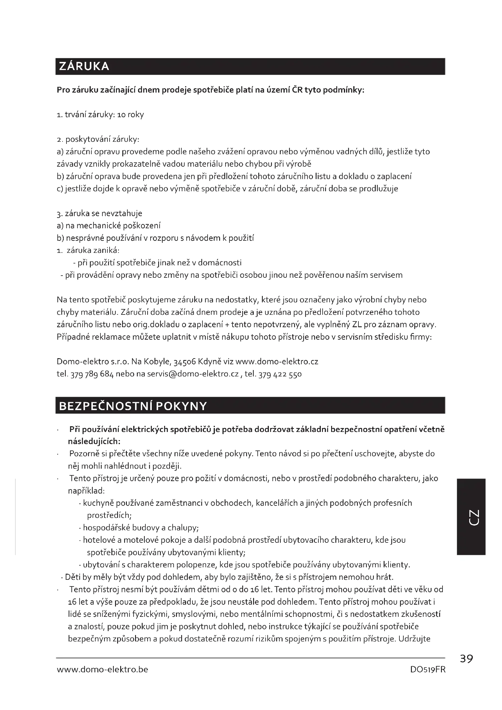 Symbol na přístroji či na jeho obalu znamená, že s tímto výrobkem není možno nakládat jako s běžným domovním odpadem, nýbrž musí být odevzdán na místech určených ke sběru a likvidaci elektrických a elektronických zařízení. Dodržením tohoto doporučení chráníte životní prostředí a zdraví spoluobčanů. Více informací o možnostech likvidace nebezpečného odpadu obdržíte na obecních nebo městských úřadech, sběrných dvorech nebo v prodejně, kde jste přístroj zakoupili. Obalové materiály jsou recyklovatelné, nakládejte s nimi podle předpisů pro životní prostředí.45 DO519FR www.domo-elektro.be