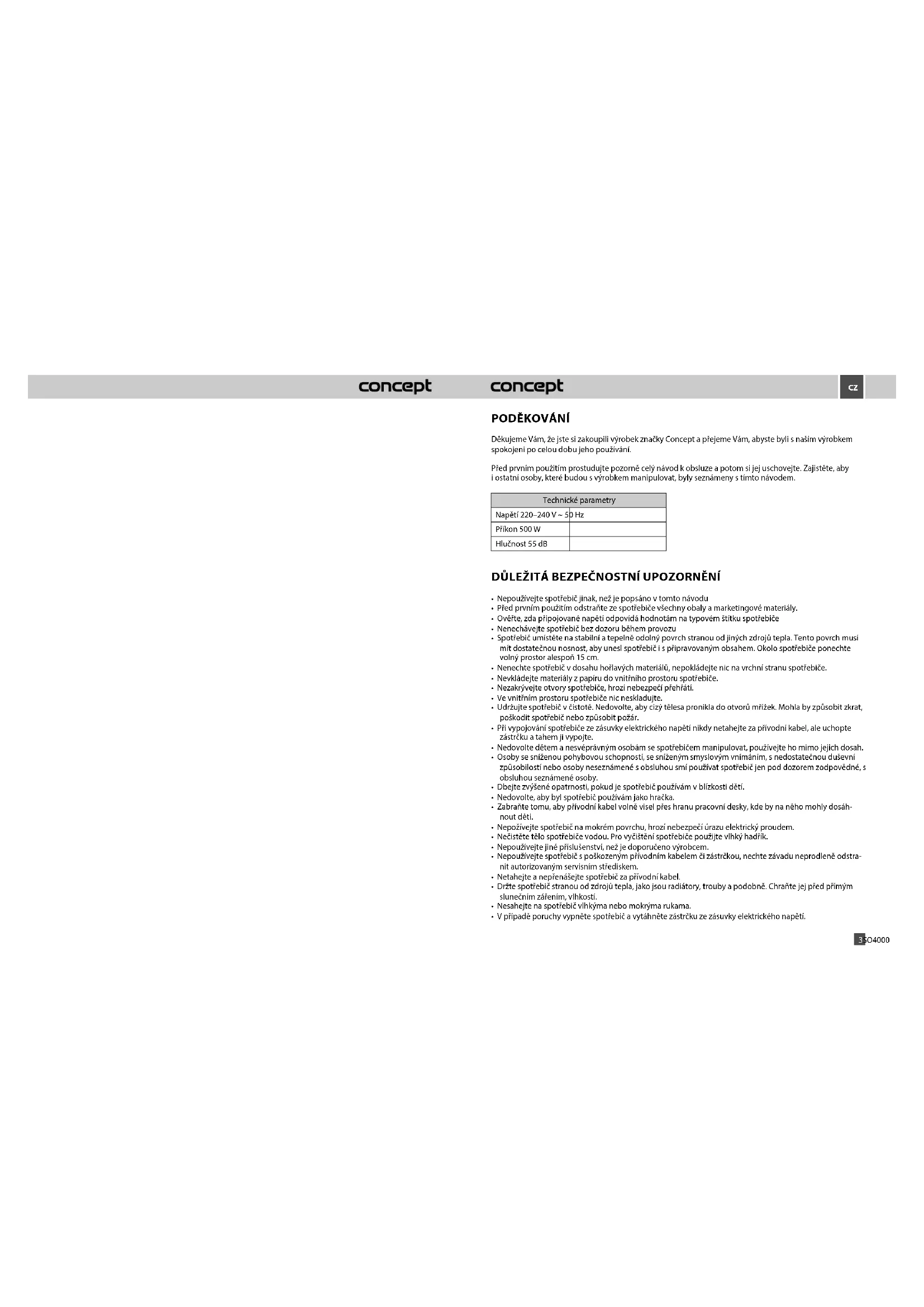 Děkujeme Vám, že jste si zakoupili výrobek značky Concept apřejeme Vám, abyste byli snaším výrobkem spokojeni pocelou dobu jeho používání. Před prvním použitím prostudujte pozorně celý návod kobsluze apotom si jej uschovejte. Zajistěte, aby iostatní osoby, které budou svýrobkem manipulovat, byly seznámeny stímto návodem. Technické parametry Napětí 220–240 V~ 50 Hz Příkon 500 W Hlučnost 55 dB DŮLEŽITÁ BEZPEČNOSTNÍ UPOZORNĚNÍ