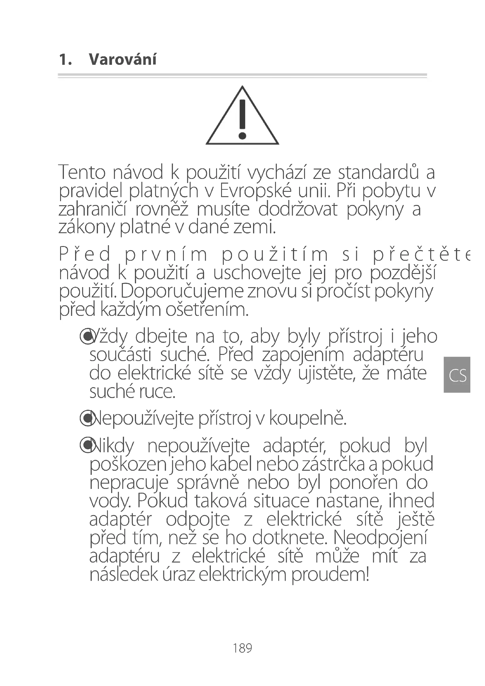 ☑Vždy dbejte na to, aby byly přístroj i jeho součásti suché. Před zapojením adaptéru do elektrické sítě se vždy ujistěte, že máte suché ruce.