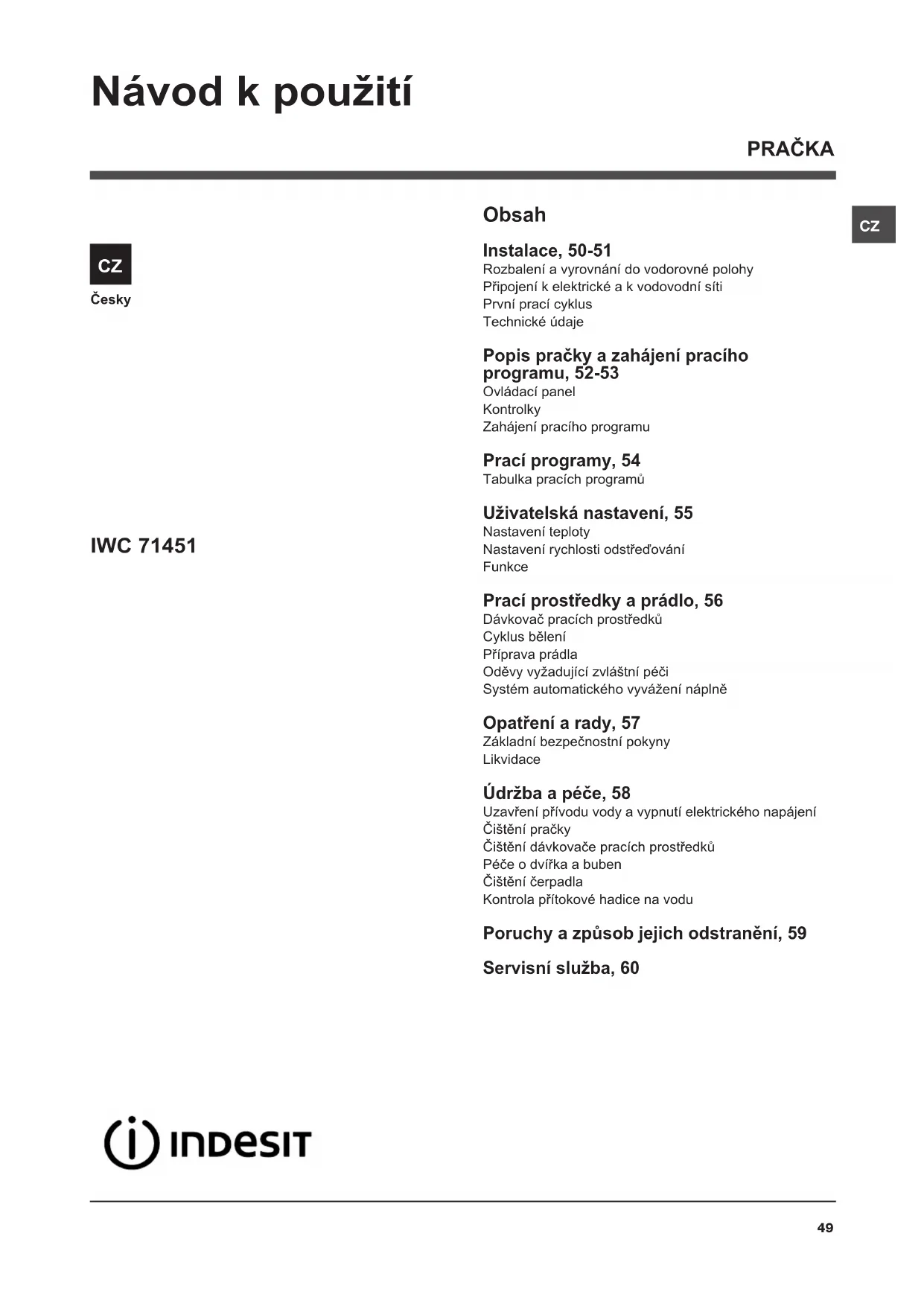 Česky Obsah Instalace, 50-51 Rozbalení a vyrovnání do vodorovné polohy Připojení k elektrické a k vodovodní síti První prací cyklus Technické údaje Popis pračky a zahájení pracího programu, 52-53 Ovládací panel Kontrolky Zahájení pracího programu Prací programy, 54 Tabulka pracích programů Uživatelská nastavení, 55 Nastavení teploty Nastavení rychlosti odstřeďování Funkce Prací prostředky a prádlo, 56 Dávkovač pracích prostředků Cyklus bělení Příprava prádla Oděvy vyžadující zvláštní péči Systém automatického vyvážení náplně Opatření a rady, 57 Základní bezpečnostní pokyny Likvidace Údržba a péče, 58 Uzavření přívodu vody a vypnutí elektrického napájení Čištění pračky Čištění dávkovače pracích prostředků Péče o dvířka a buben Čištění čerpadla Kontrola přítokové hadice na vodu Poruchy a způsob jejich odstranění, 59 Servisní služba, 60