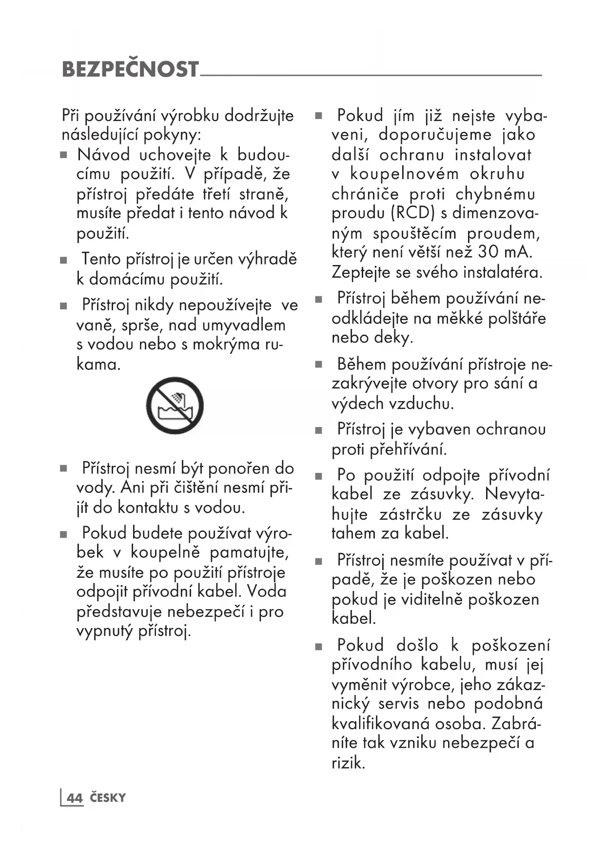 Pokud budete používat výro- bek v koupelně pamatujte, že musíte po použití přístroje odpojit přívodní kabel. Voda představuje nebezpečí i pro vypnutý přístroj.ČESKY