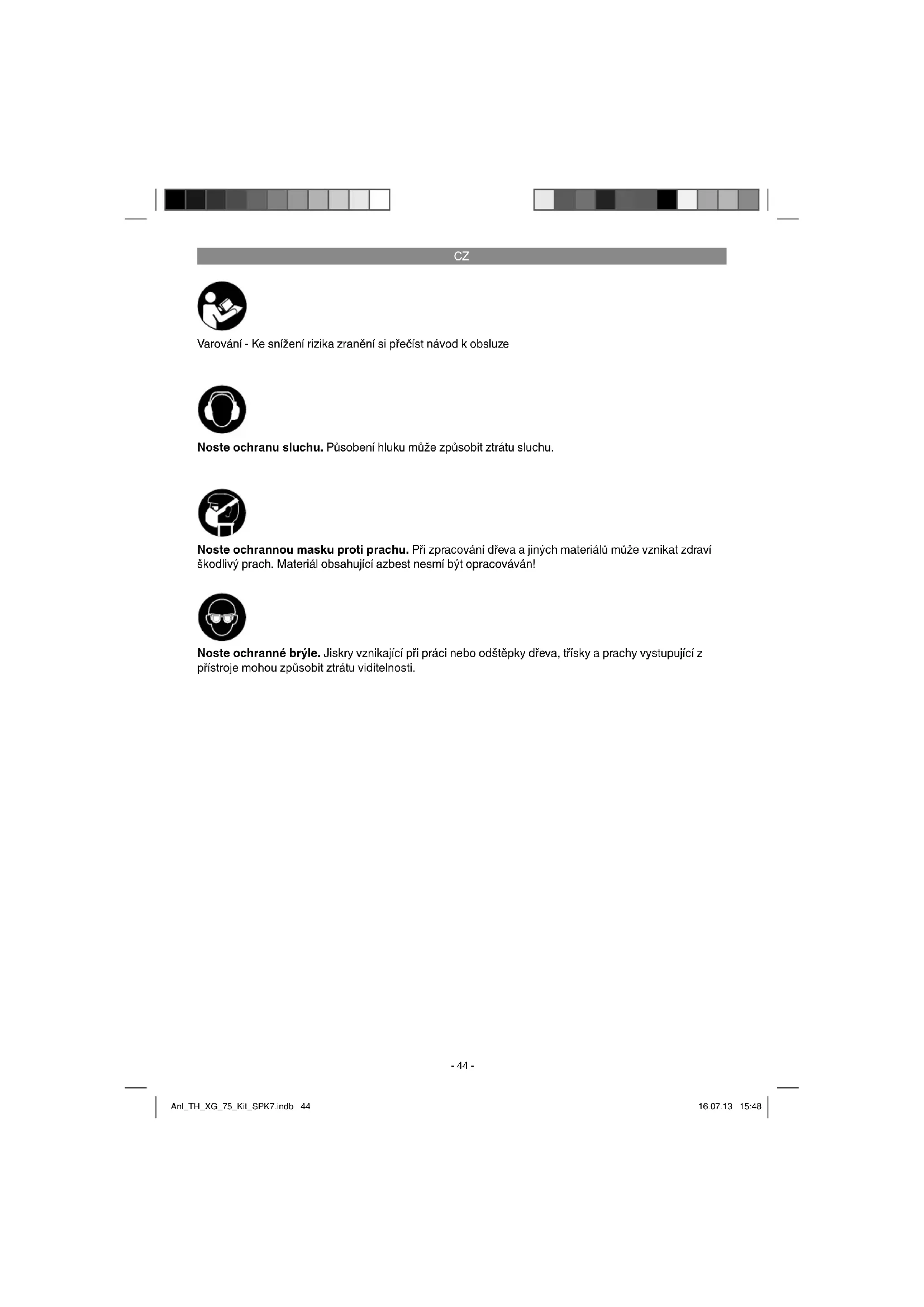 Varování - Ke snížení rizika zranění si přečíst návod k obsluze Noste ochranu sluchu. Působení hluku může způsobit ztrátu sluchu. Noste ochranné brýle. Jiskry vznikající při práci nebo odštěpky dřeva, třísky a prachy vystupující z přístroje mohou způsobit ztrátu viditelnosti. Noste ochrannou masku proti prachu. Při zpracování dřeva a jiných materiálů může vznikat zdraví škodlivý prach. Materiál obsahující azbest nesmí být opracováván! Anl_TH_XG_75_Kit_SPK7.indb 44Anl_TH_XG_75_Kit_SPK7.indb 44 16.07.13 15:4816.07.13 15:48CZ