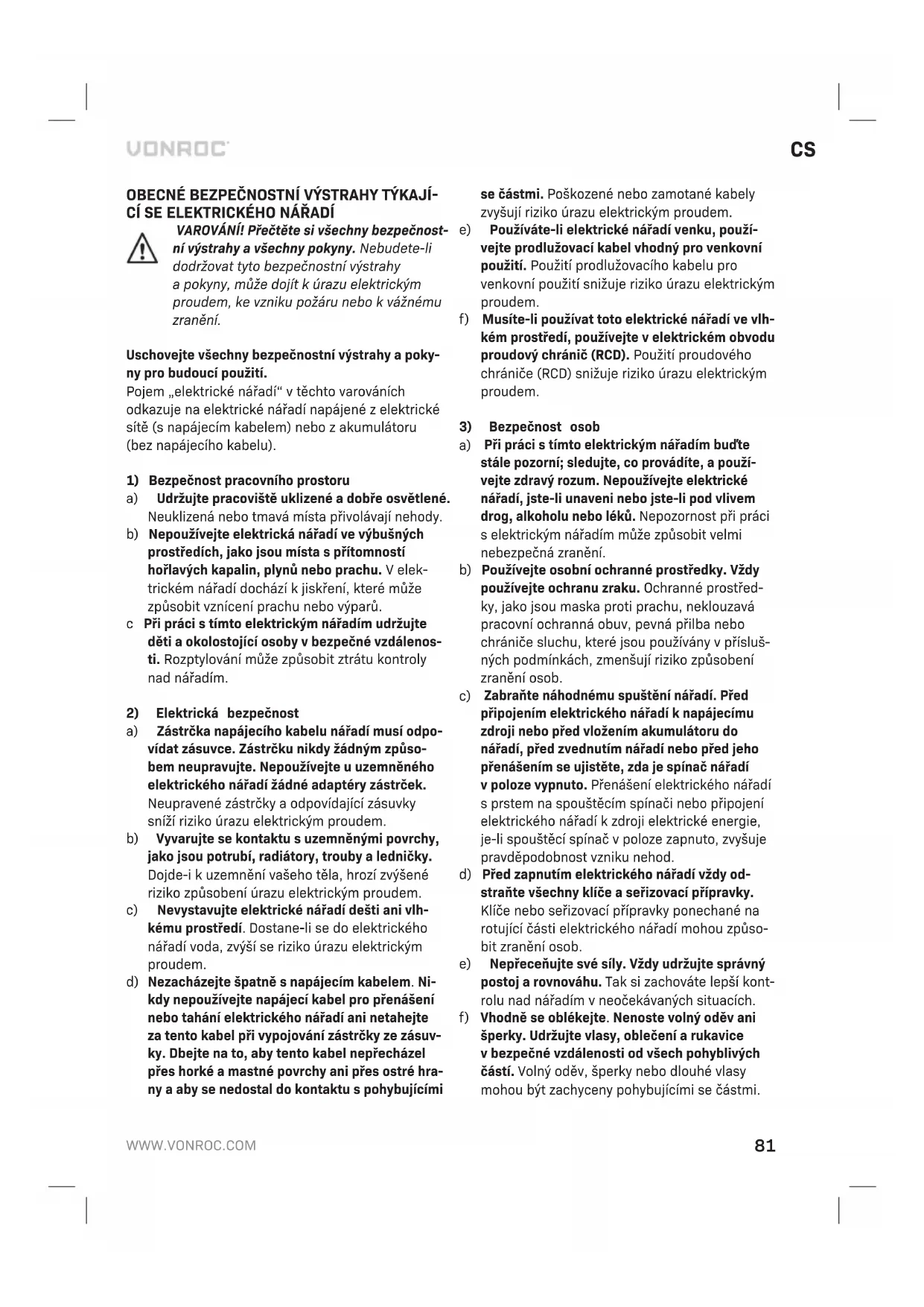 Poškozená alikvidovaná elektrická nebo elektronická zařízení musí být odevzdána ve sběrných dvorech, které jsou určeny pro tento účel. Pouze pro země EU Nevyhazujte elektrická nářadí do běžného domácího odpadu. Podle evropské směrnice 2012/19/EC týkající se likvidace elektrických aelektronických zařízení ajejí implementace do vnitrostátního práva, musí být nepoužívaná elektrická nářadí shromažďo- vána odděleně ajejich likvidace musí být provedena tak, aby nedošlo kohrožení životního prostředí. ZÁRUKA Výrobky VONROC jsou vyvíjeny vsouladu spoža- davky norem na nejvyšší kvalitu aje zaručeno, že po dobu platné záruky, která začíná běžet dnem původního nákupu, nebudou na těchto výrobcích žádné vady materiálu, ani vady způsobené špatným dílenským zpracováním. Dojde-li během tohoto období kzávadě vdůsledku vady materiálu nebo dílenského zpracování, kontaktujte přímo fi rmu VONROC. Ztéto záruky jsou vyloučeny následující případy: