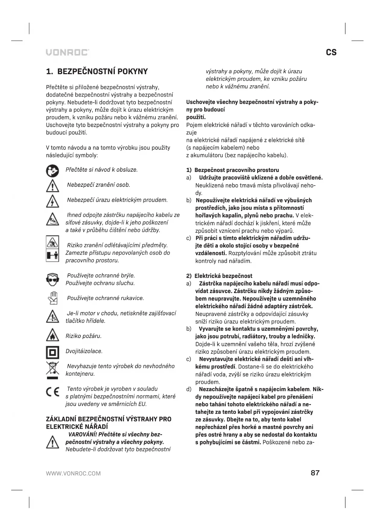 Poškozená alikvidovaná elektrická nebo elektronická zařízení musí být odevzdána ve sběrných dvorech, které jsou určeny pro tento účel. Pouze pro země EU Nevyhazujte elektrická nářadí do běžného domácího odpadu. Podle evropské směrnice 2012/19/EC týka- jící se likvidace elektrických aelektronických zařízení ajejí implementace do vnitrostátního práva, musí být nepoužívaná elektrická nářadí shromažďována odděleně ajejich likvidace musí být provedena tak, aby nedošlo kohrožení životního prostředí. ZÁRUKA Výrobky VONROC jsou vyveny vsouladu spoža- davky norem na nejvyšší kvalitu aje zaručeno, že po dobu platné záruky, která začíná běžet dnem původního nákupu, nebudou na těchto výrobcích žádné vady materiálu, ani vady způsobené špatným dílenským zpracováním. Dojde-li během tohoto období kzávadě vdůsledku vady materiálu nebo dílenského zpracování, kontaktujte přímo firmu VONROC. Ztéto záruky jsou vyloučeny následující případy: