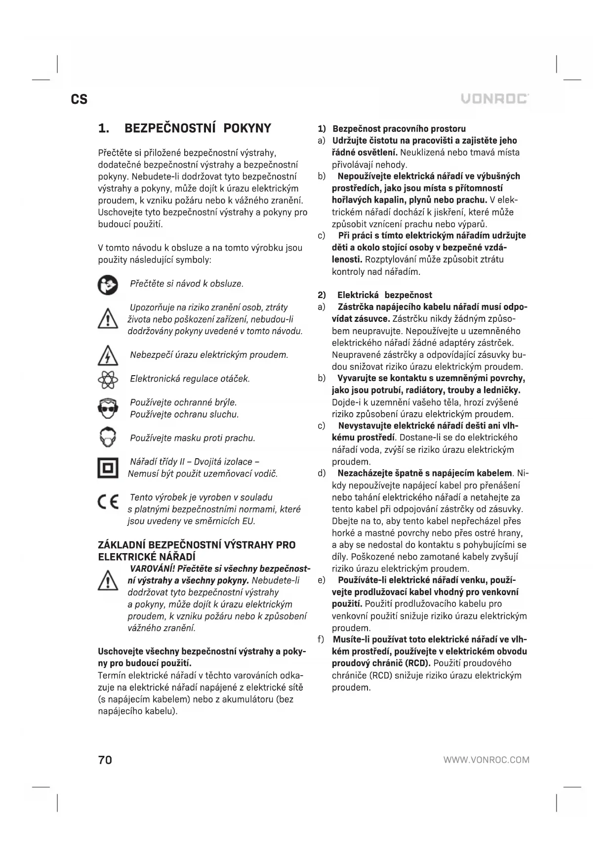 Poškozená alikvidovaná elektrická nebo elektronická zařízení musí být odevzdána ve sběrných dvorech, které jsou určeny pro tento účel. Pouze pro země EU Nevyhazujte elektrická nářadí do běžného domácího odpadu. Podle evropské směrnice 2012/19/EC týkající se likvidace elektrických aelektronických zařízení ajejí implementace do vnitrostátního práva, musí být nepoužívaná elektrická nářadí shromažďo- vána odděleně ajejich likvidace musí být provedena tak, aby nedošlo kohrožení životního prostředí. ZÁRUKA Výrobky VONROC jsou vyvíjeny vsouladu spoža- davky norem na nejvyšší kvalitu aje zaručeno, že po dobu platné záruky, která začíná běžet dnem původního nákupu, nebudou na těchto výrobcích žádné vady materiálu, ani vady způsobené špatnýmTR