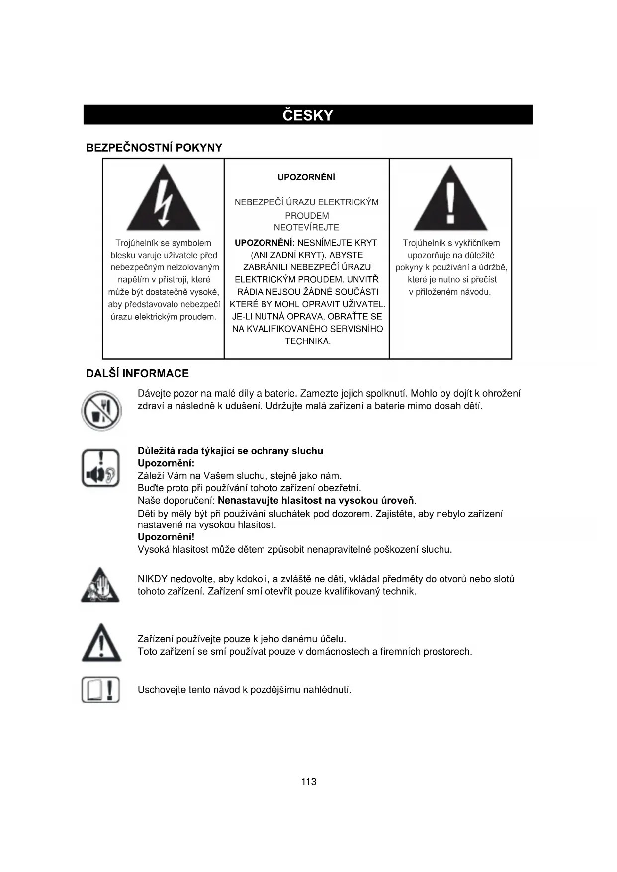 NIKDY nedovolte, aby kdokoli, a zvláště ne děti, vkládal předměty do otvorů nebo slotů tohoto zařízení. Zařízení smí otevřít pouze kvalifikovaný technik.