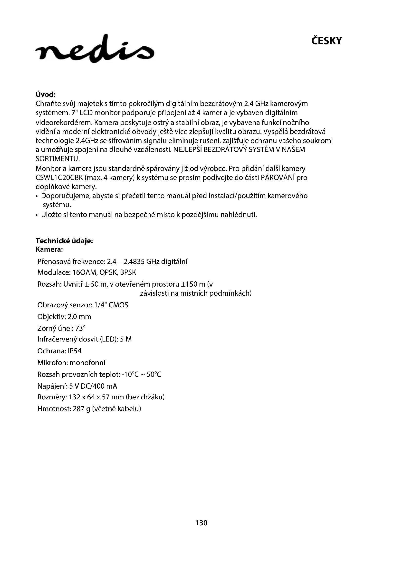 - Uložte si tento manuál na bezpečné místo k pozdějšímu nahlédnutí. Technické údaje: Kamera: Přenosová frekvence: 2.4 – 2.4835 GHz digitální Modulace: 16QAM, QPSK, BPSK Rozsah: Uvnitř ± 50 m, v otevřeném prostoru ±150 m (v závislosti na místních podmínkách) Obrazový senzor: 1/4" CMOS Objektiv: 2.0 mm Zorný úhel: 73° Infračervený dosvit (LED): 5 M Ochrana: IP54 Mikrofon: monofonní Rozsah provozních teplot: -10°C ~ 50°C Napájení: 5 V DC/400 mA Rozměry: 132 x 64 x 57 mm (bez držáku) Hmotnost: 287 g (včetně kabelu)131 ČESKY LCD monitor: Přijímací frekvence: 2.4 – 2.4835 GHz digitální Kanály: 4 Velikost: 7" TFT/LCD Max. rozlišení: 800 RGB (hor.)* 480 (vert.) obrazových bodů SD karta: až do 32 GB (není součástí) Obnovovací kmitočet videa: 25 snímků za sekundu (max). 10 snímků za sekundu (4 kamery) Obnovovací kmitočet záznamu: 25 snímků za sekundu na kanál Rozlišení videa: CIF/VGA Formát videa: AVI USB: 2.0 Jazyk nabídky: Angličtina, němčina, francouzština a holandština Výstupní úroveň video: 1 Vp-p/75 Ohm Výstupní úroveň audio: 2 V rms při 600 Ω monofonní Zvukový/video výstupní konektor: