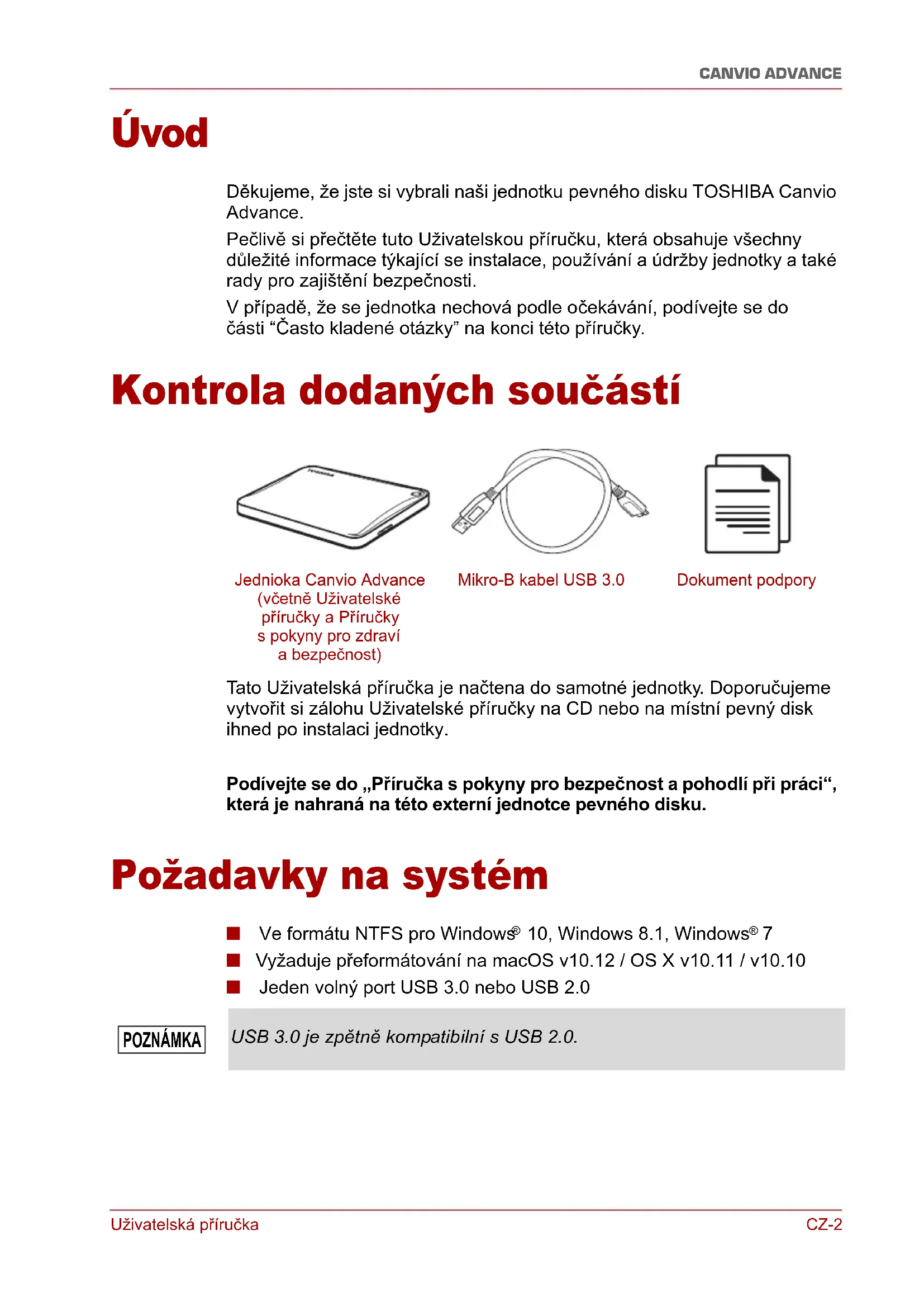 - Regulační opatření Uživatelská příručka CZ-2 CANVIO ADVANCE Úvod Děkujeme, že jste si vybrali naši jednotku pevného disku TOSHIBA Canvio Advance. Pečlivě si přečtěte tuto Uživatelskou příručku, která obsahuje všechny důležité informace týkající se instalace, používání a údržby jednotky a také rady pro zajištění bezpečnosti. V případě, že se jednotka nechová podle očekávání, podívejte se do části “Často kladené otázky” na konci této příručky. Kontrola dodaných součástí Tato Uživatelská příručka je načtena do samotné jednotky. Doporučujeme vytvořit si zálohu Uživatelské příručky na CD nebo na místní pevný disk ihned po instalaci jednotky. Podívejte se do „Příručka s pokyny pro bezpečnost a pohodlí při práci“, která je nahraná na této externí jednotce pevného disku. Požadavky na systém ■ Ve formátu NTFS pro Windows p. 7