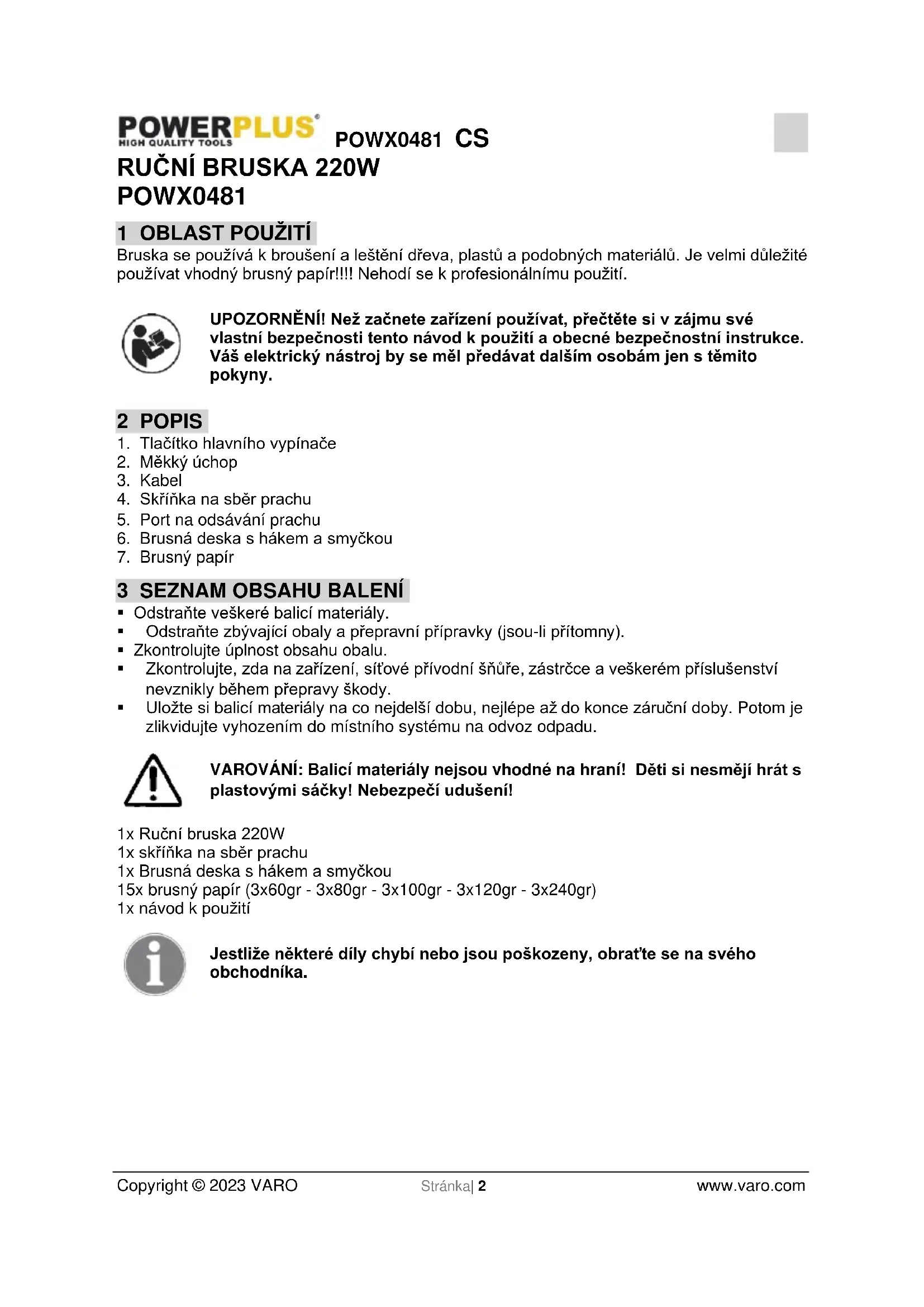 - Uložte si balicí materiály na co nejdelší dobu, nejlépe až do konce záruční doby. Potom je zlikvidujte vyhozením do místního systému na odvoz odpadu. VAROVÁNÍ: Balicí materiály nejsou vhodné na hraní! Děti si nesmějí hrát s plastovými sáčky! Nebezpečí udušení! 1x Ruční bruska 220W 1x skříňka na sběr prachu 1x Brusná deska s hákem a smyčkou 15x brusný papír (3x60gr - 3x80gr - 3x100gr - 3x120gr - 3x240gr) 1x návod k použití Jestliže některé díly chybí nebo jsou poškozeny, obraťte se na svého obchodníka.POWX0481 CS Copyright © 2023 VARO Stránka| 3 www.varo.com 4 SYMBOLY V tomto návodu a u přístroje jsou používány následující symboly: