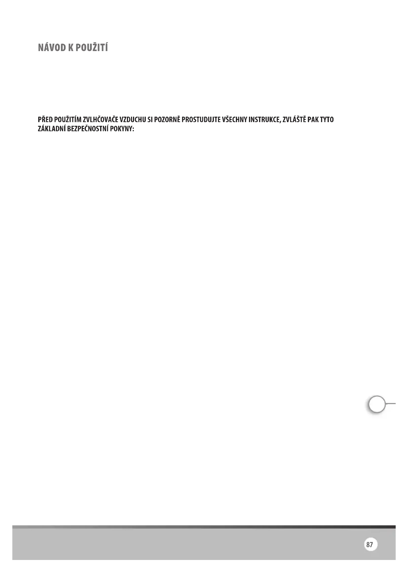 - Zvlhčovač vzduchu nepoužívejte za předpokladu, že vzduch v místnosti je již dostatečně vlhký (minimálně 50% relativní vlhkost). Nadbytečná vlhkost se zpravidla projevuje kondenzací vlhka na studeném povrchu nebo na studených zdech místnosti. Pro přesné stanovení míry vlhkosti místnosti používejte vlhkoměr, který lze zakoupit ve většině prodejen domácích spotřebičů, ve velkých obchodních centrech nebo v supermarketech.