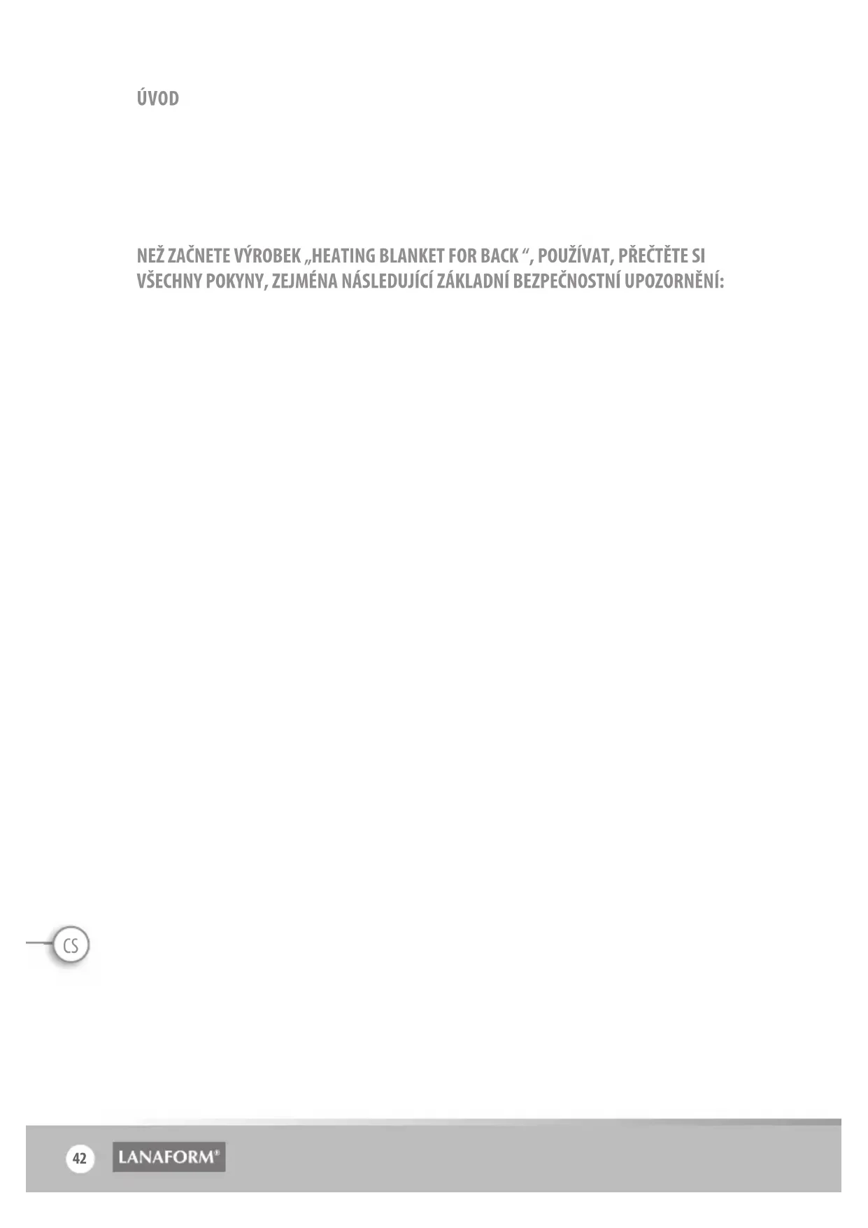 Heating Blanket for BackCS ÚVOD Děkujeme, že jste si vybrali vyhřívanou vestu „Heating Blanket for Back“ značky LANAFORM®. Vyhřívaná vesta „Heating Blanket S1“ značky LANAFORM® podléhá přísným testům, které splňují platné evropské normy. Vesta navíc nabízí postupné nastavení teploty, abyste ho mohli využívat i jindy než pro zahřátí v zimě nebo ve vlhkém počasí. NEŽ ZAČNETE VÝROBEK „HEATING BLANKET FOR BACK “, POUŽÍVAT, PŘEČTĚTE SI VŠECHNY POKYNY, ZEJMÉNA NÁSLEDUJÍCÍ ZÁKLADNÍ BEZPEČNOSTNÍ UPOZORNĚNÍ: Dodržováním následujících pokynů zabráníte vzniku popálenin, požáru či úrazům elektrickým proudem nebo jiným zraněním: