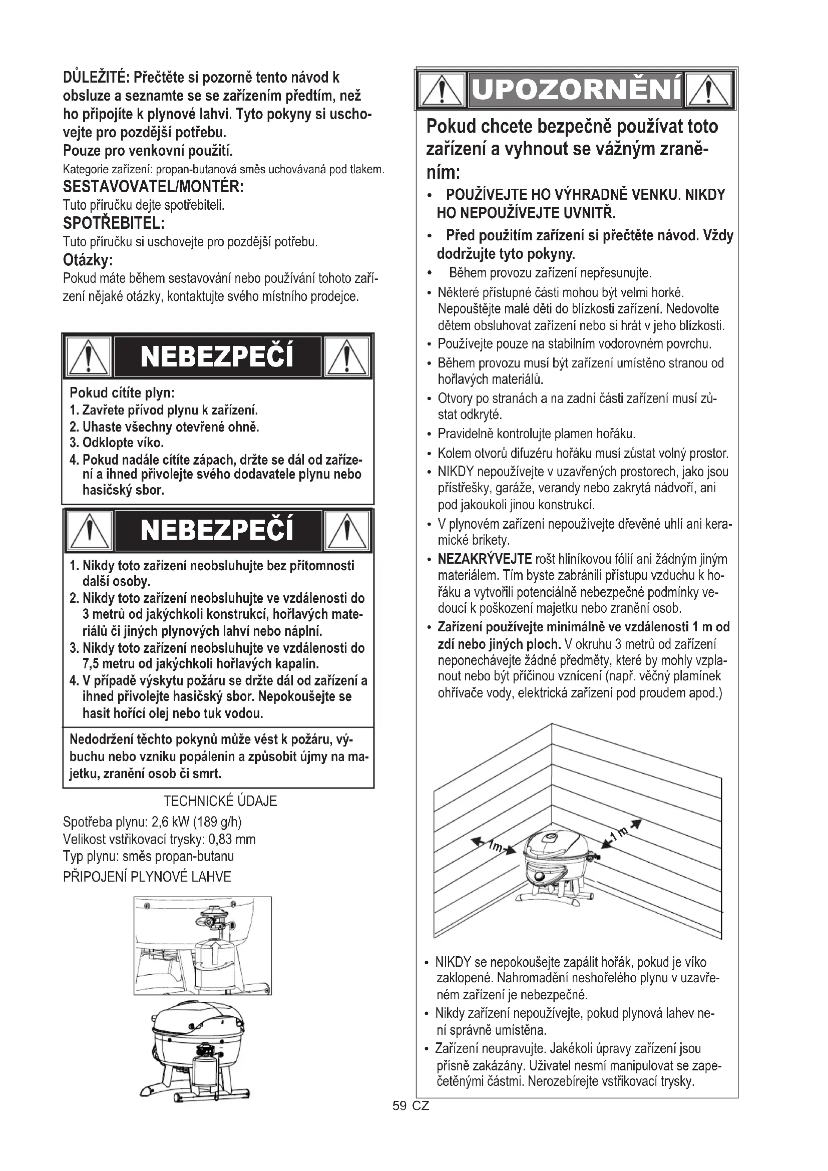 NEBEZPEČÍ Pokud cítíte plyn:1. Zavřete přívod plynu k zařízení.2. Uhaste všechny otevřené ohně.3. Odklopte víko.4. Pokud nadále cítíte zápach, držte se dál od zaříze-ní a ihned přivolejte svého dodavatele plynu nebo hasičský sbor. NEBEZPEČÍ Nedodržení těchto pokynů může vést k požáru, vý-buchu nebo vzniku popálenin a způsobit újmy na ma-jetku, zranění osob či smrt.TECHNICKÉ ÚDAJESpotřeba plynu: 2,6 kW (189 g/h)Velikost vstřikovací trysky: 0,83 mmTyp plynu: směs propan-butanuPŘIPOJENÍ PLYNOVÉ LAHVE DŮLEŽITÉ: Přečtěte si pozorně tento návod k obsluze a seznamte se se zařízením předtím, než ho připojíte k plynové lahvi. Tyto pokyny si uscho- vejte pro pozdější potřebu. Pouze pro venkovní použití. Kategorie zařízení: propan-butanová směs uchovávaná pod tlakem. SESTAVOVATEL/MONTÉR: Tuto příručku dejte spotřebiteli. SPOTŘEBITEL: Tuto příručku si uschovejte pro pozdější potřebu. Otázky: Pokud máte během sestavování nebo používání tohoto zaří-zení nějaké otázky, kontaktujte svého místního prodejce. UPOZORNĚNÍ Pokud chcete bezpečně používat toto zařízení a vyhnout se vážným zraně- ním: Ÿ POUŽÍVEJTE HO VÝHRADNĚ VENKU. NIKDY HO NEPOUŽÍVEJTE UVNITŘ. Ÿ Před použitím zařízení si přečtěte návod. Vždy dodržujte tyto pokyny. Ÿ Během provozu zařízení nepřesunujte. Ÿ Některé přístupné části mohou být velmi horké. Nepouštějte malé děti do blízkosti zařízení. Nedovolte dětem obsluhovat zařízení nebo si hrát v jeho blízkosti. Ÿ Používejte pouze na stabilním vodorovném povrchu. Ÿ Během provozu musí být zařízení umístěno stranou od hořlavých materiálů. Ÿ Otvory po stranách a na zadní části zařízení musí zů- stat odkryté. Ÿ Pravidelně kontrolujte plamen hořáku. Ÿ Kolem otvorů difuzéru hořáku musí zůstat volný prostor. Ÿ NIKDY nepoužívejte v uzavřených prostorech, jako jsou přístřešky, garáže, verandy nebo zakrytá nádvoří, ani pod jakoukoli jinou konstrukcí. Ÿ V plynovém zařízení nepoužívejte dřevěné uhlí ani kera- mické brikety. Ÿ NEZAKRÝVEJTE rošt hliníkovou fólií ani žádným jiným materiálem. Tím byste zabránili přístupu vzduchu k ho-řáku a vytvořili potenciálně nebezpečné podmínky ve-doucí k poškození majetku nebo zranění osob. Ÿ Zařízení používejte minimálně ve vzdálenosti 1 m od zdí nebo jiných ploch. V okruhu 3 metrů od zařízení neponechávejte žádné předměty, které by mohly vzpla-nout nebo být příčinou vznícení (např. věčný plamínek ohřívače vody, elektrická zařízení pod proudem apod.) Ÿ NIKDY se nepokoušejte zapálit hořák, pokud je víko zaklopené. Nahromadění neshořelého plynu v uzavře-ném zařízení je nebezpečné. Ÿ Nikdy zařízení nepoužívejte, pokud plynová lahev ne- ní správně umístěna. Ÿ Zařízení neupravujte. Jakékoli úpravy zařízení jsou přísně zakázány. Uživatel nesmí manipulovat se zape-četěnými částmi. Nerozebírejte vstřikovací trysky. 1 m