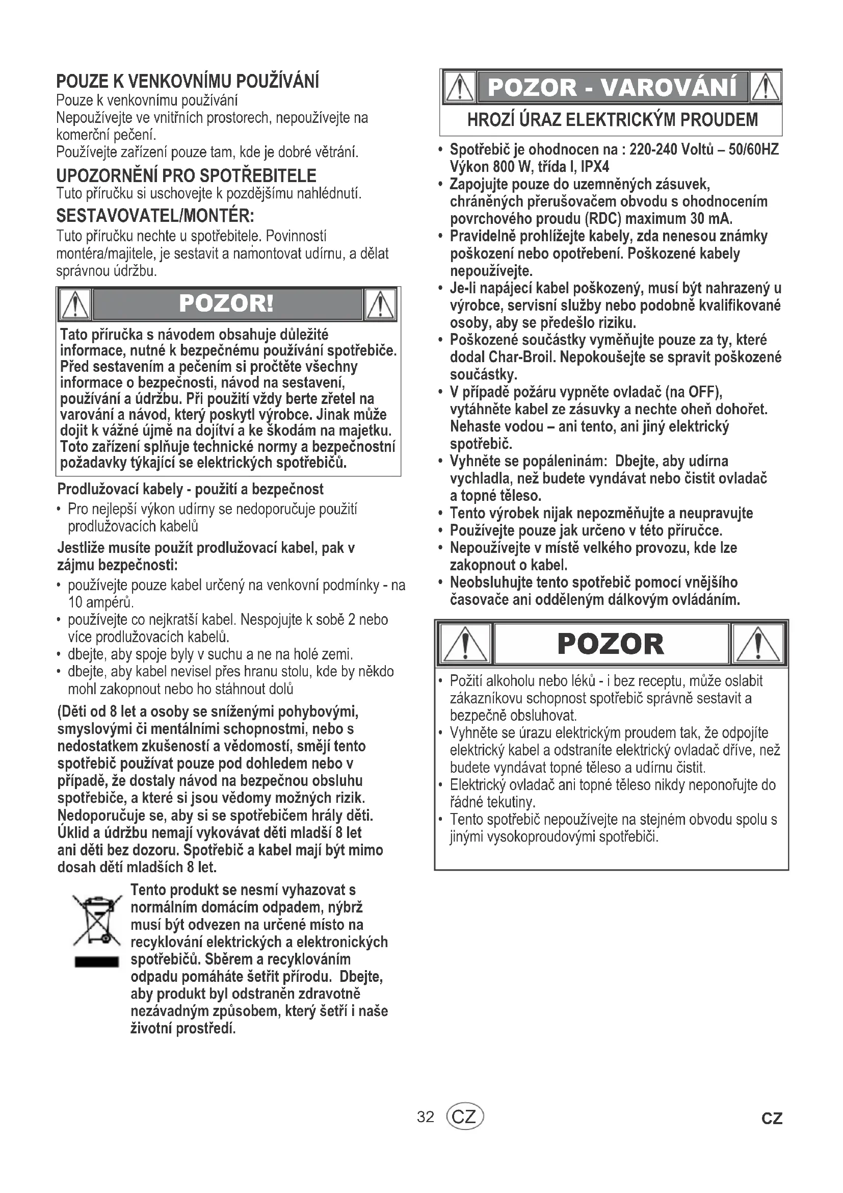 SESTAVOVATEL/MONTÉR: Tuto příručku nechte u spotřebitele. Povinností montéra/majitele, je sestavit a namontovat udírnu, a dělat správnou údržbu. Pouze k venkovnímu používání Nepoužívejte ve vnitřních prostorech, nepoužívejte na komerční pečení. Používejte zařízení pouze tam, kde je dobré větrání. Tato příručka s návodem obsahuje důležité informace, nutné k bezpečnému používání spotřebiče. Před sestavením a pečením si pročtěte všechny informace o bezpečnosti, návod na sestavení, používání a údržbu. Při použití vždy berte zřetel na varování a návod, který poskytl výrobce. Jinak může dojit k vážné újmě na dojítví a ke škodám na majetku. Toto zařízení splňuje technické normy a bezpečnostní požadavky týkající se elektrických spotřebičů.