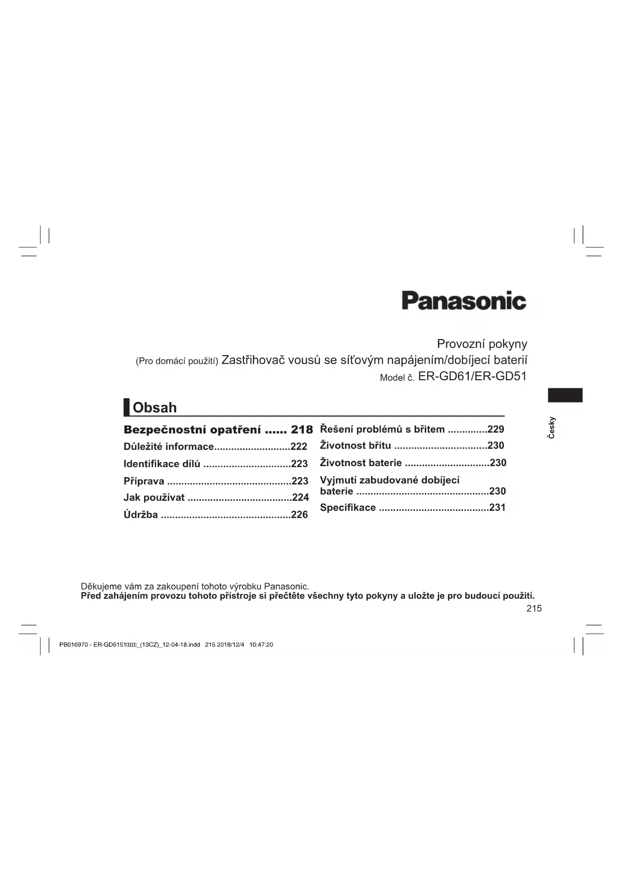 Neprodleně se obraťte na lékaře. PB016970 - ER-GD6151_(13CZ)_12-04-18.indd 221 2018/12/4 10:47:22222 Česky VAROVÁNÍ Po vyjmutí z přístroje nenechávejte nabíjecí baterii v dosahu dětí či kojenců. - V případě náhodného požití baterie hrozí nebezpečí zranění.