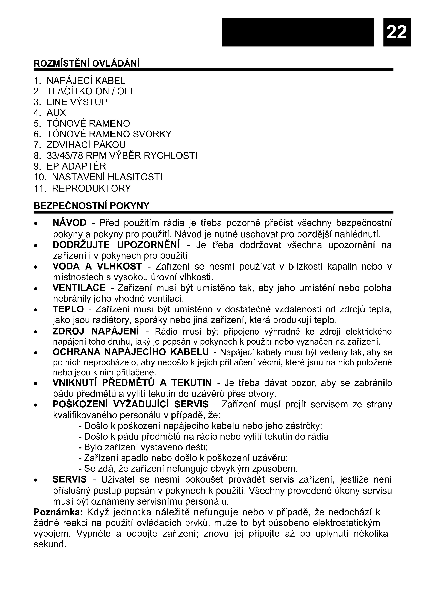 Poznámka: Pokud již tento zdroj nepoužíváte, odpojte jack od rádia, protože má přednost před ostatními funkcemi. LINE-OUT Přístroj můžete připojit k externímu audiosystému (k reproduktorům nebo k zesilovači) přes [LINE OUT] (3) pomocí audiokabelu RCA (není součástí dodávky).24 Čeština Tento symbol na výrobku, jeho příslušenství nebo obalu označuje, že při pozdější likvidaci výrobku (z ja-kýchkoliv důvodů) nesmí být s výrobkem zacházeno jako s domovním odpadem. Výrobek zlikvidujte jeho předáním na sběrné místo pro likvidaci použitých elektrických a elektronických zařízení šetrnou k životnímu prostředí. Zajištěním jejich správné likvidace zabráníte vzniku potenciálních rizik pro životní prostředí a lidské zdraví, která by mohla vzniknout nesprávným zacházením s odpady. Kromě toho re-cyklace odpadových materiálů napomáhá udržení přírodních zdrojů surovin pro příští generace. Podrobné informace k likvidaci tohoto výrobku šetrné k životnímu prostředí získáte u pracovníka ochrany životního prostředí místního (městského nebo obvodního) úřadu nebo v prodejně, ve které jste výrobek zakoupili. POKYNY PRO SPRÁVNOU LIKVIDACI VÝROBKU (likvidaci použitých elektrických a elektronických zařízení) UPOZORNĚNÍ Vykřičník uvnitř trojúhelníka na zadní straně skříňky přístroje upozorňuje uživatele na důležité pokyny pro obsluhu a ošetřování přístroje, uvedené v jeho doprovodné dokumentaci. čeština Symbol blesku uvnitř trojúhelníka na zadní straně skříňky přístroje upozorňuje uživatele na existenci životu ne- bezpečného napětí na některých dílech uvnitř skříňky přístroje. Nevyjímejte přístroj ze skříňky – riziko úrazu elektrickým proudem. Uvnitř skříňky nejsou díly, které by mohl opravit nebo seřídit jeho uživatel bez odpovídajícího vybavení a kvalifikace. Bude-li přístroj vyžadovat seřízení nebo opravu kontaktujte odborný servis. Zásahem do přístroje v době platnosti záruky se vystavujete riziku ztráty event. záručních plnění. Přístroj je konstruován pro napájení střídavým napětím 230 V / 50 Hz z elektrické sítě. Pokud nebudete přístroj delší dobu používat odpojte jej od elektrické sítě vyjmutím vidlice síťového kabelu přístroje ze síťové zásuvky. Chraňte přístroj před zmoknutím, postříkáním nebo politím jakoukoliv kapalinou. Vypnutím přístroje není přístroj odpojen od elektrické sítě. Pro odpojení přístroje od elektrické sítě vyjměte vidlici síťo- vého kabelu přístroje ze síťové zásuvky. Před zapnutím přístroje překontrolujte všechna připojení k přístroji. Okolo přístroje ponechejte na všech stranách dostatečný volný prostor, nutný pro cirkulaci vzduchu okolo přístroje. Je tak odváděno teplo vznikající během jeho provozu. Neumísťujte přístroj na přímém slunci nebo v blízkosti zdrojů tepla. Vysokými teplotami je významně zkracována život-nost elektronických dílů přístroje. TECHNICKÉ ÚDAJE Zdroj napájení: AC 230V ~ 50Hz. Reproduktorů Výstupní výkon: 2 x 1.5 Watt rms. Maximální Výstupní výkon: 2 x 12 Watt Všeobecné Aux-In 3.5mm jack zástrčka. Line Out: RCA zástrčka. Změny designu a technických údajů vyhrazeny bez předchozího oznámení.25 Slovenský